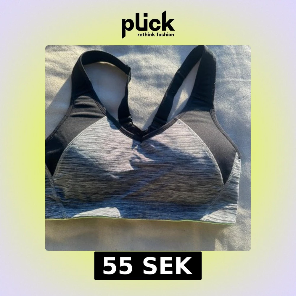 Säljer en grå och svart sport-bh från H&M. Den har breda axelband och en bekväm passform, perfekt för träning. Materialet är stretchigt och andas bra. Den har en justerbar rygg för optimal komfort.