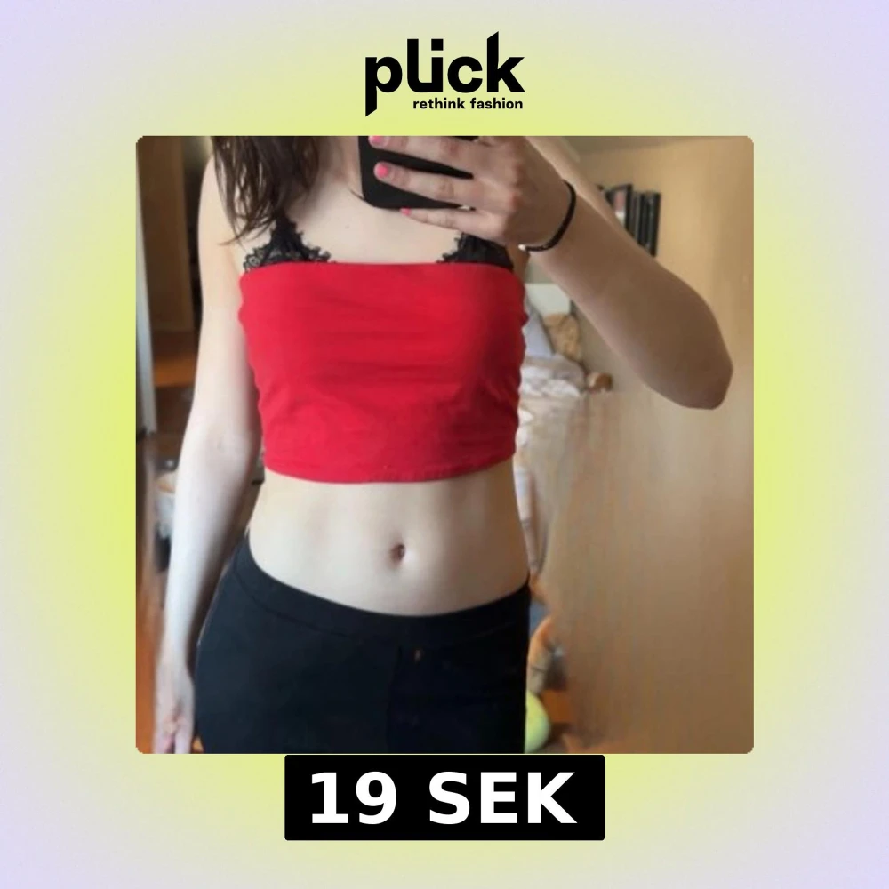 Säljer en röd croppad tubtopp med svarta spetsdetaljer upptill. Perfekt för sommardagar eller när du vill ha en enkel men snygg look. Toppens material känns mjukt och stretchigt.