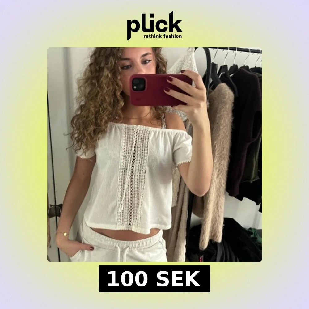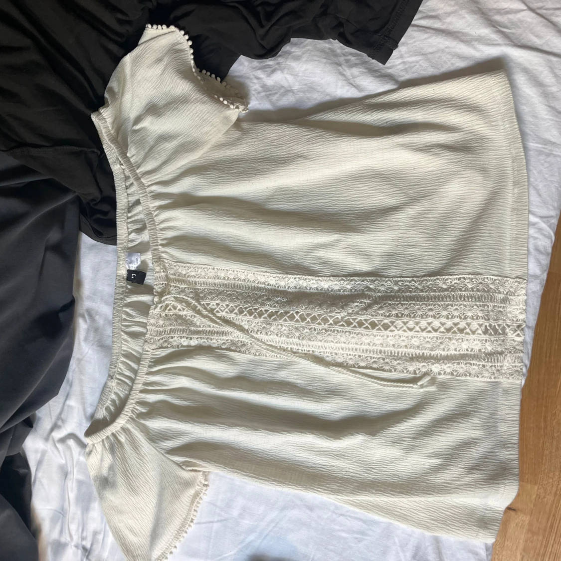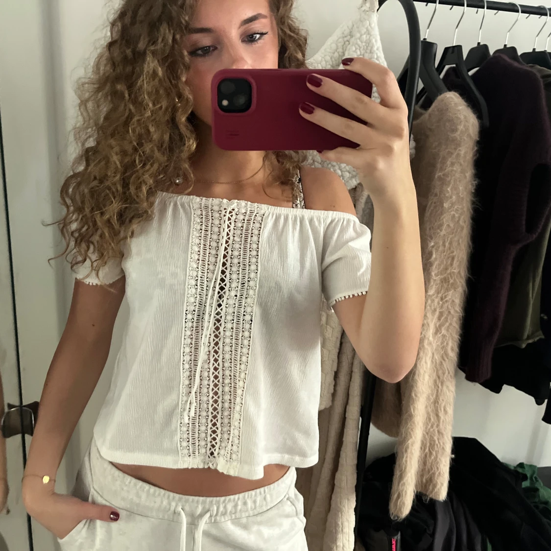 Superfin vit offshoulder blus från H&M med spets och broderade detaljer framtill. Blusen är croppad och har små bollar längs ärmsluten. Perfekt till sommaren och enkel att styla med jeans eller kjol.