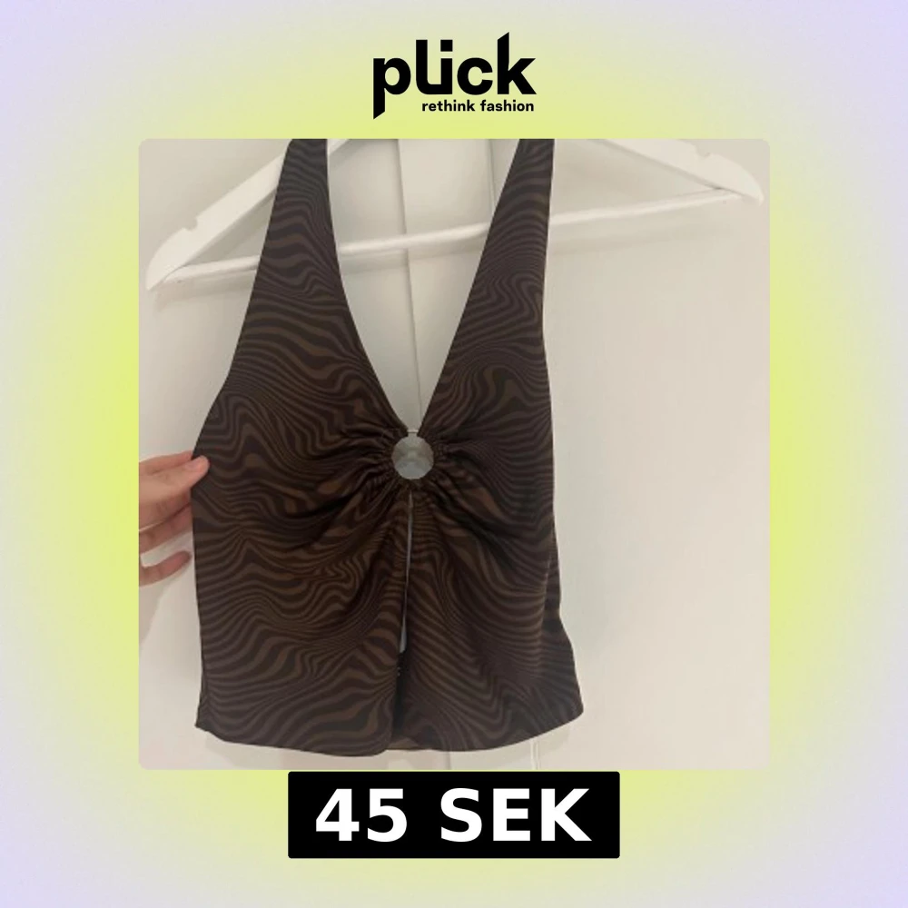Snygg brun topp från h&m med ett unikt mönster och djup v-ringning. Toppen har en ringdetalj framtill som ger en cool look. Perfekt för en kväll ute eller en avslappnad dag.