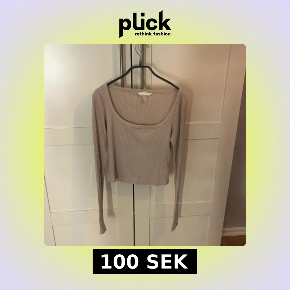 Säljer en beige ribbad långärmad topp från H&M med croppad passform och bred, rundad halsringning. Toppen är i mjukt material och har en stilren look som är enkel att matcha med jeans eller kjol. Perfekt för dig som gillar minimalistisk stil.
