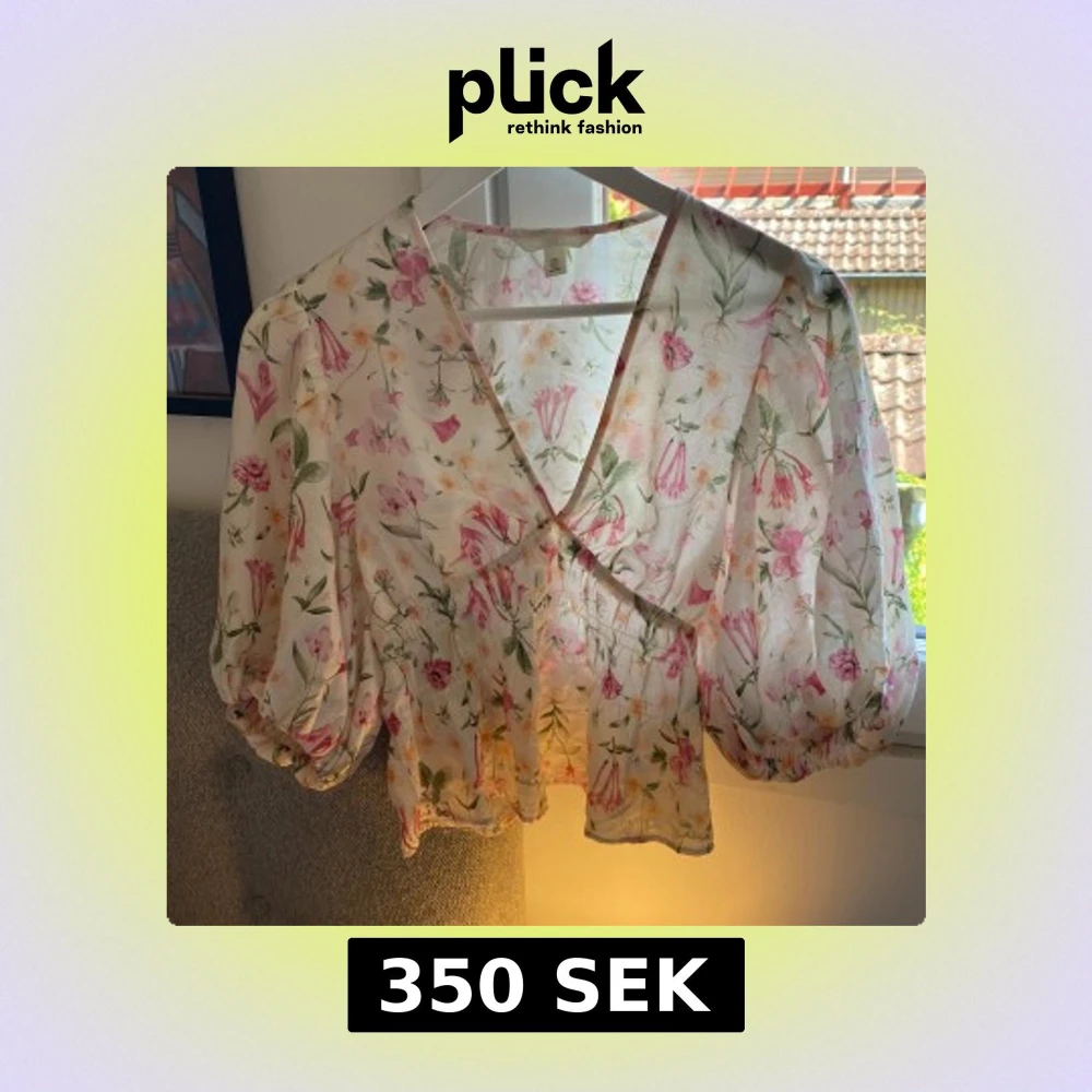 Supersöt blommig omlottblus i vitt med rosa och gröna detaljer. Blusen har puffiga trekvartsärmar, v-ringning och smock i midjan för en snygg passform. Perfekt för vår och sommar när du vill känna dig extra fin.