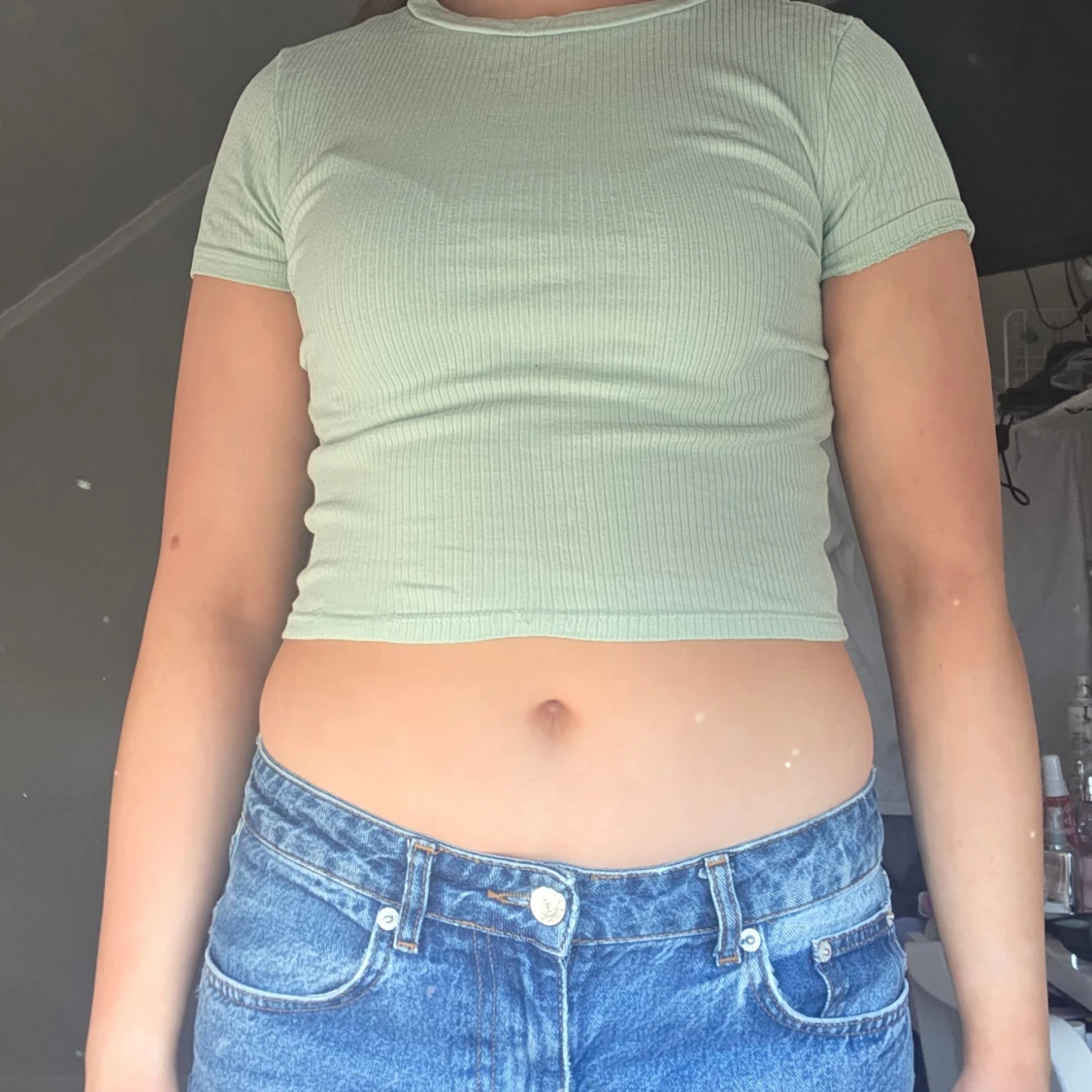Säljer en ljusgrön ribbad croppad topp med korta ärmar. Perfekt för varma dagar och en avslappnad stil. Passar bra med jeans eller kjol.
