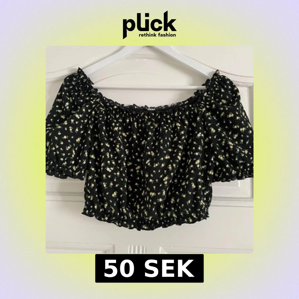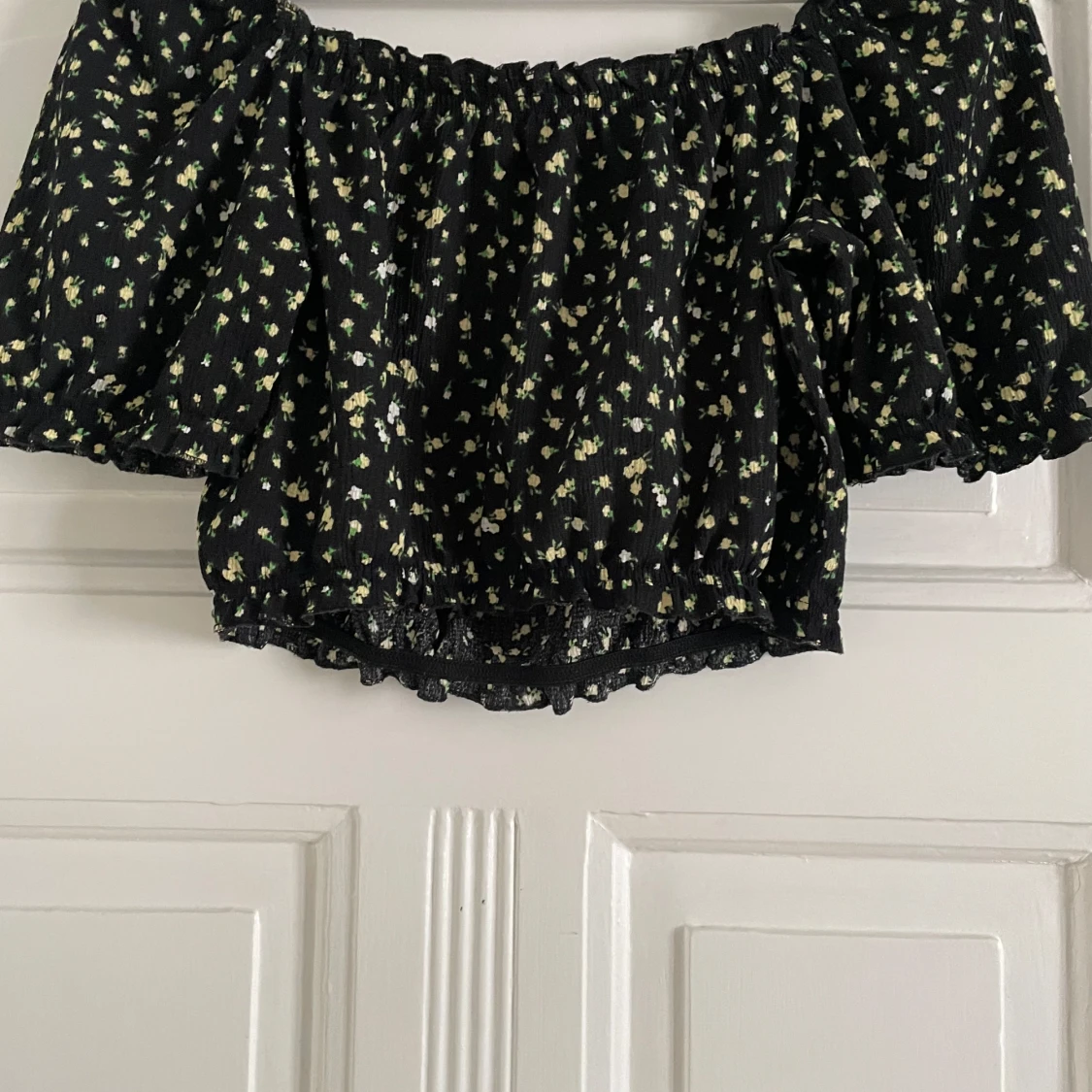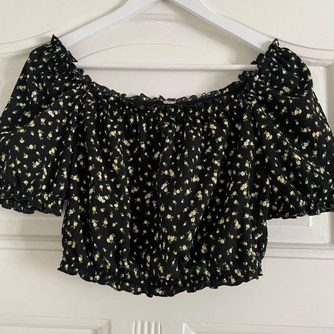 Säljer en söt svart offshoulder topp med små gula blommor. Toppen är croppad och har korta puffärmar med elastiska kanter.