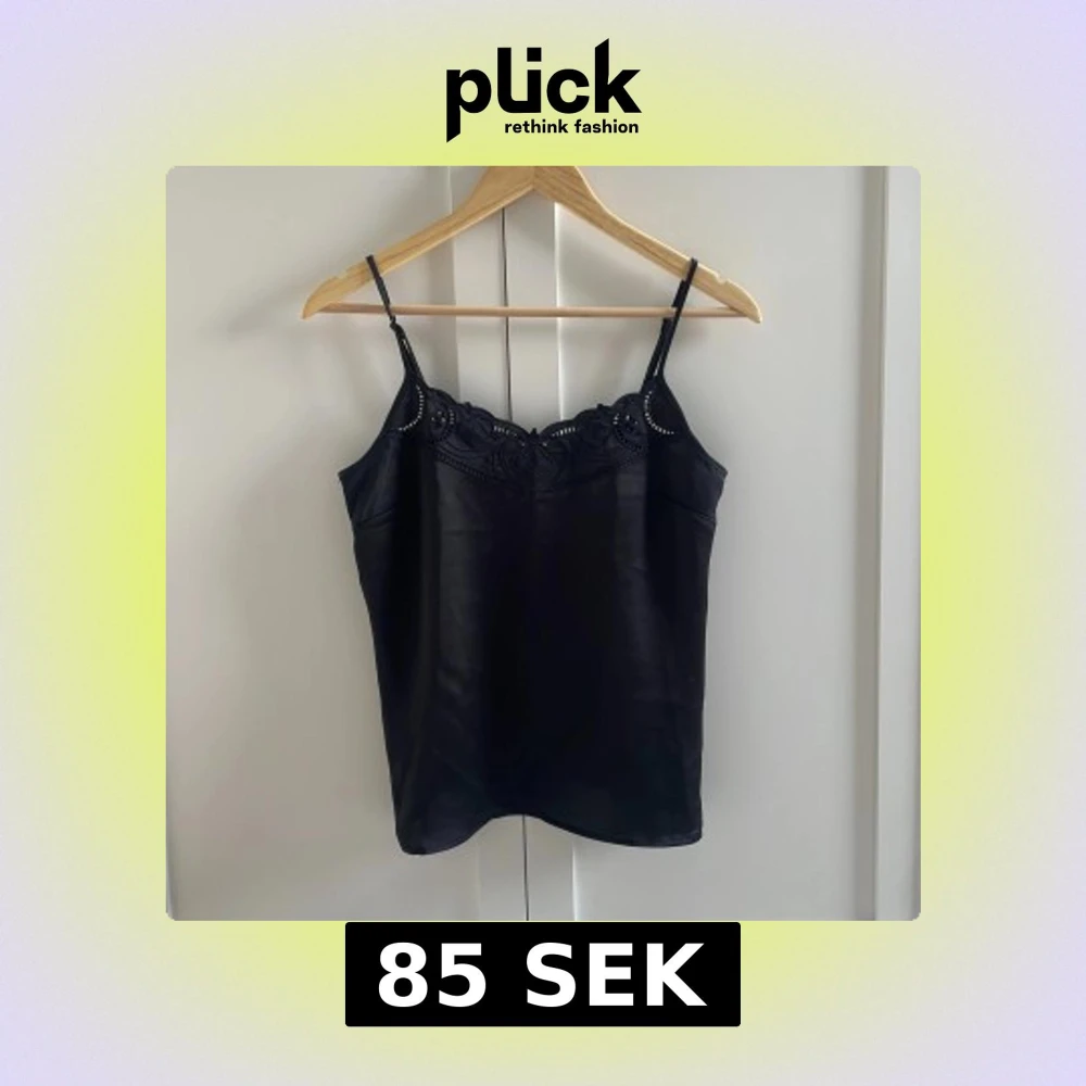 Supersnygg svart silkestopp från H&M med tunna axelband och dekorativ spets upptill. Sidenliknande material ger en lyxig känsla och toppen har en rak, enkel passform. Perfekt att styla med jeans eller kjol för en trendig look. Aldrig använd.