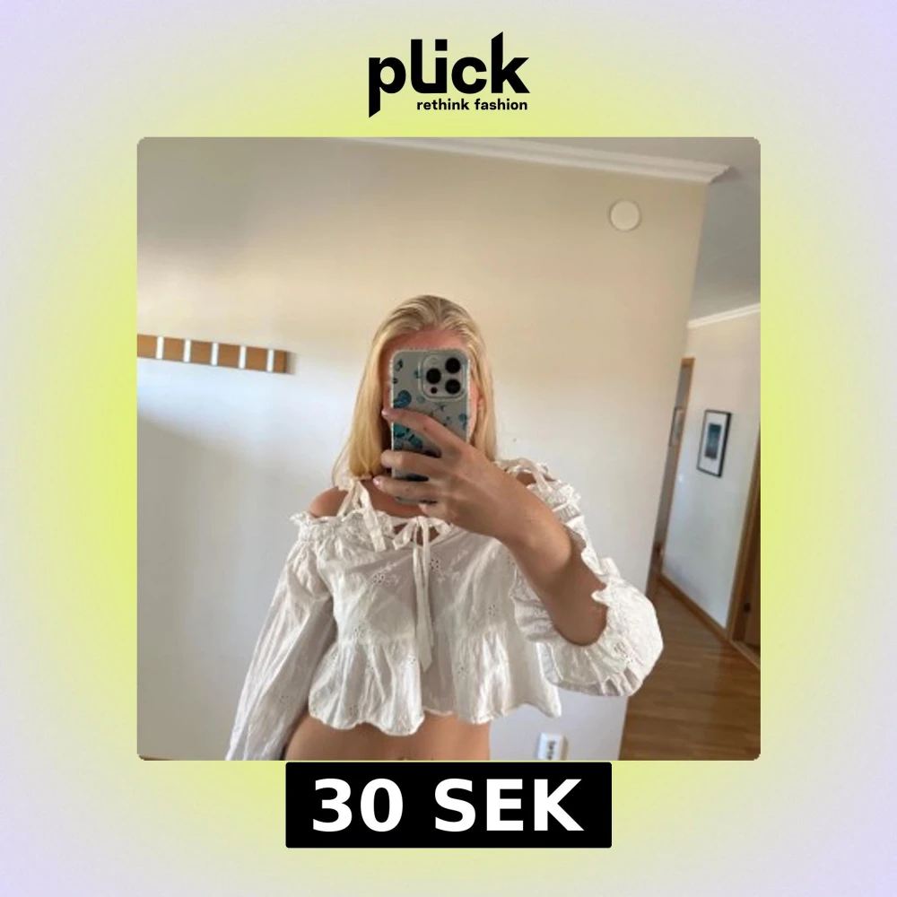 Superfin vit blus med broderade blommor och volangdetaljer. Offshoulder-modell med långa ärmar och knyt framtill. Croppad passform och romantisk vibe, perfekt till jeans eller kjol.