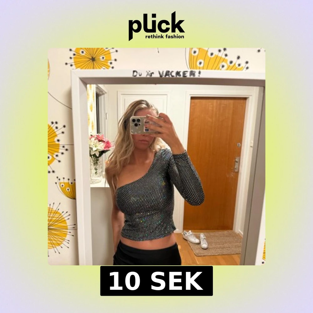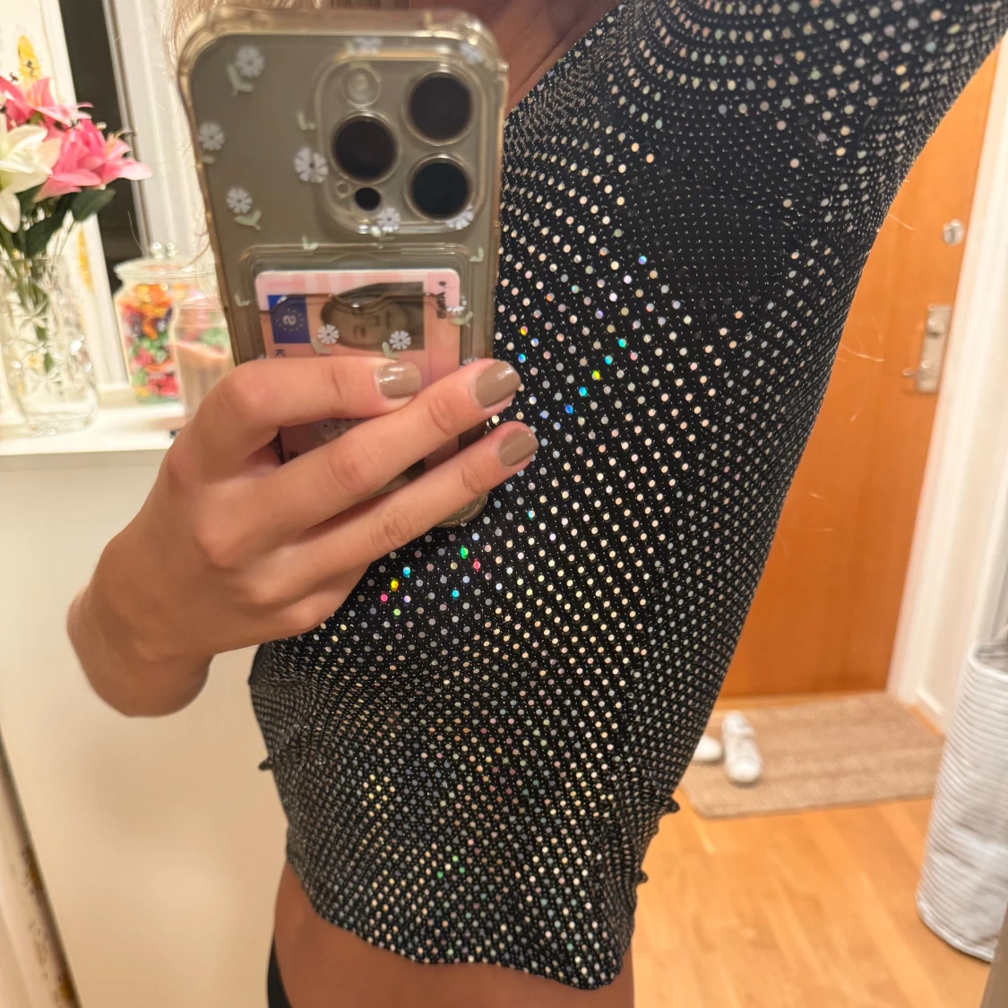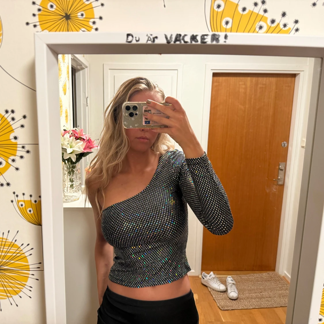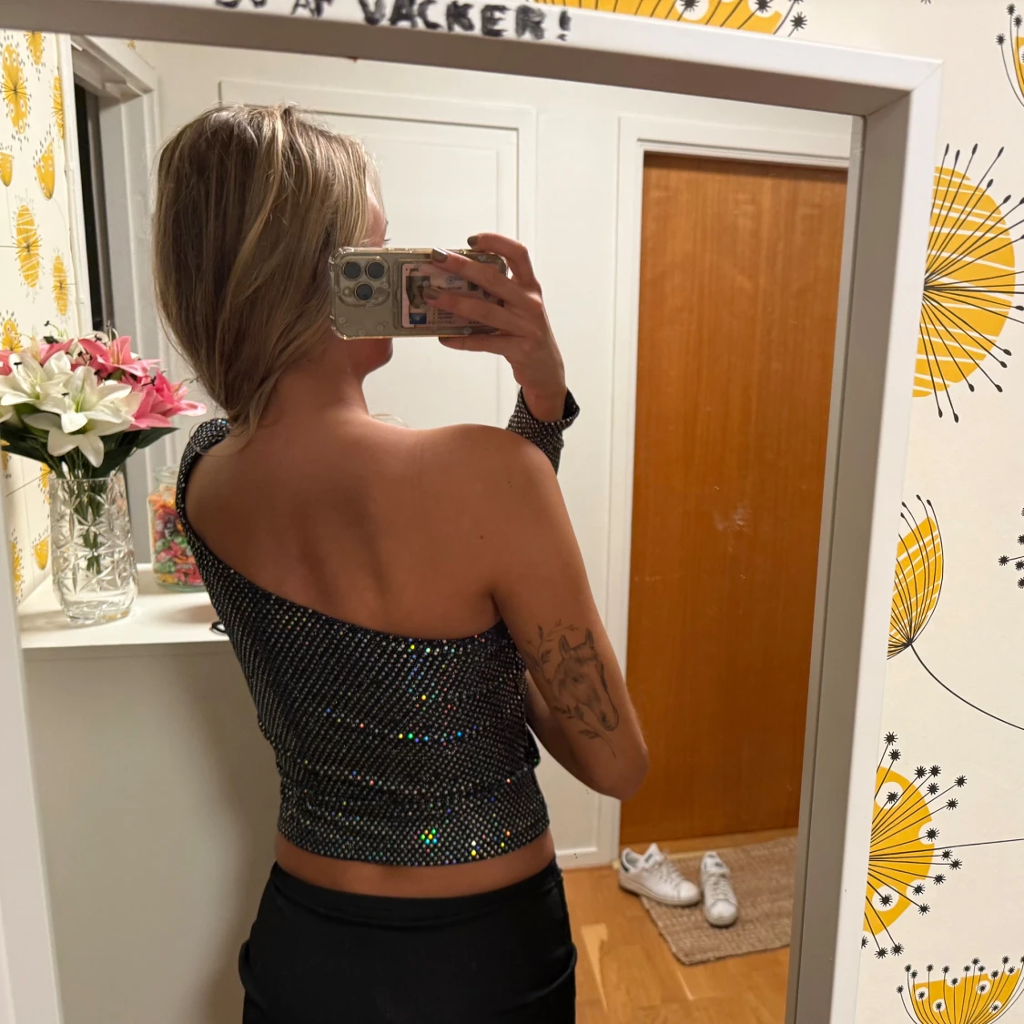 Glitter one shoulder topp. Snygg till nyår eller likande. Har tappat glittret i armhålan men syns inte om man inte har uppe armen. Sticks inte eller så.