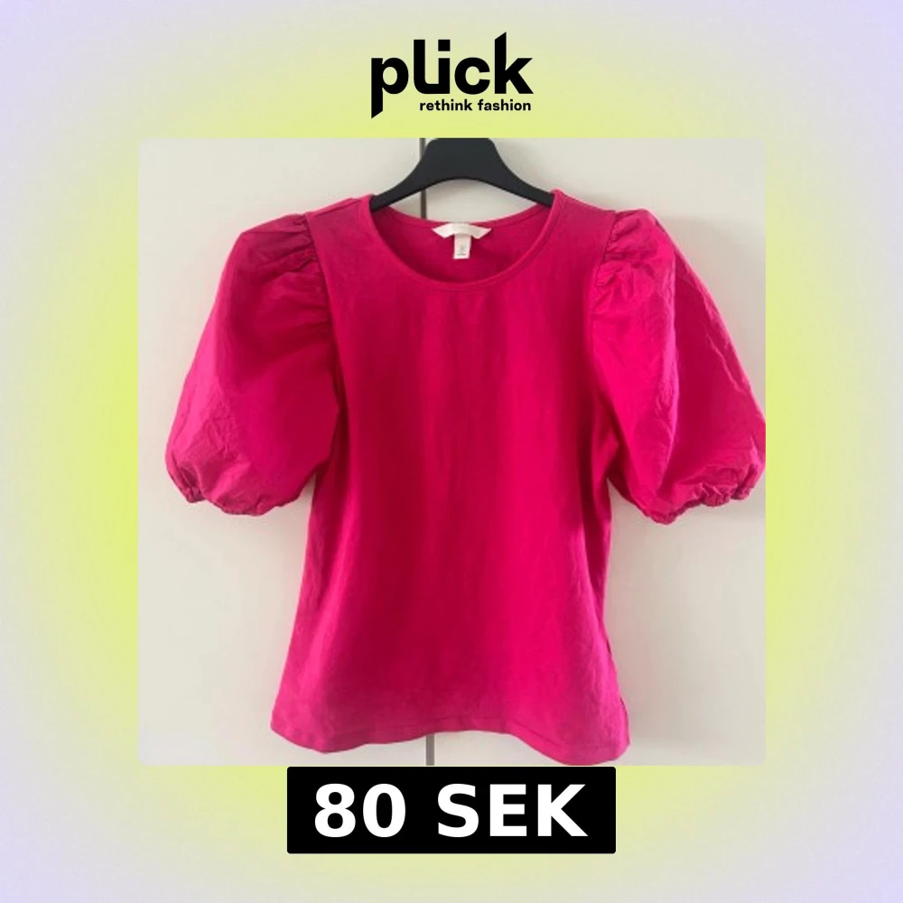 Säljer en snygg rosa topp från H&M med puffiga kortärmar. Perfekt för att ge en färgklick till din outfit. Toppen har en rund halsringning och är gjord i ett mjukt material.