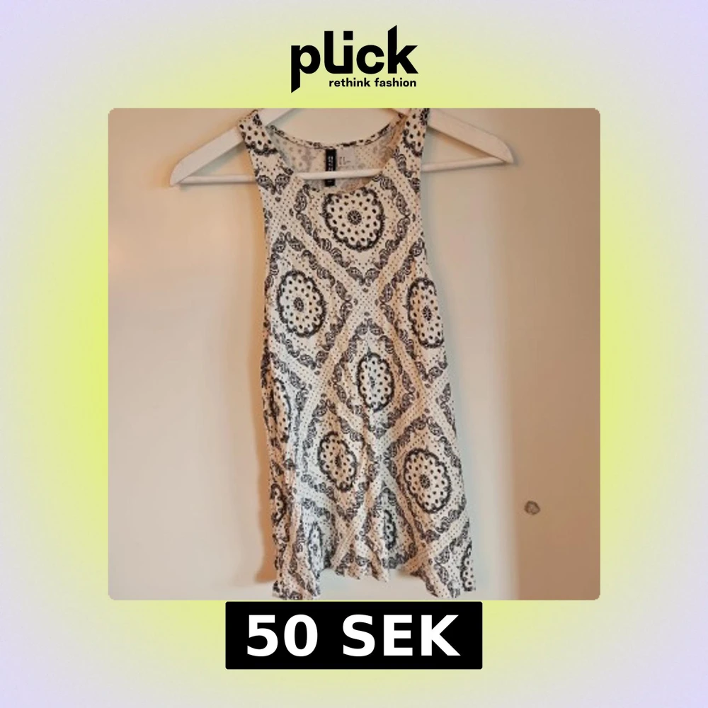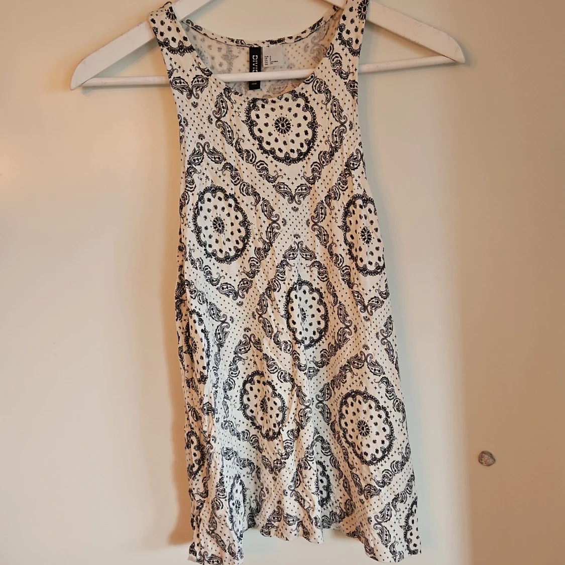 Säljer en stilren ärmlös topp från H&M med ett svart och vitt mönster. Perfekt för varma dagar eller som ett lager under en jacka. Toppen har en rund halsringning och är tillverkad i ett mjukt material.