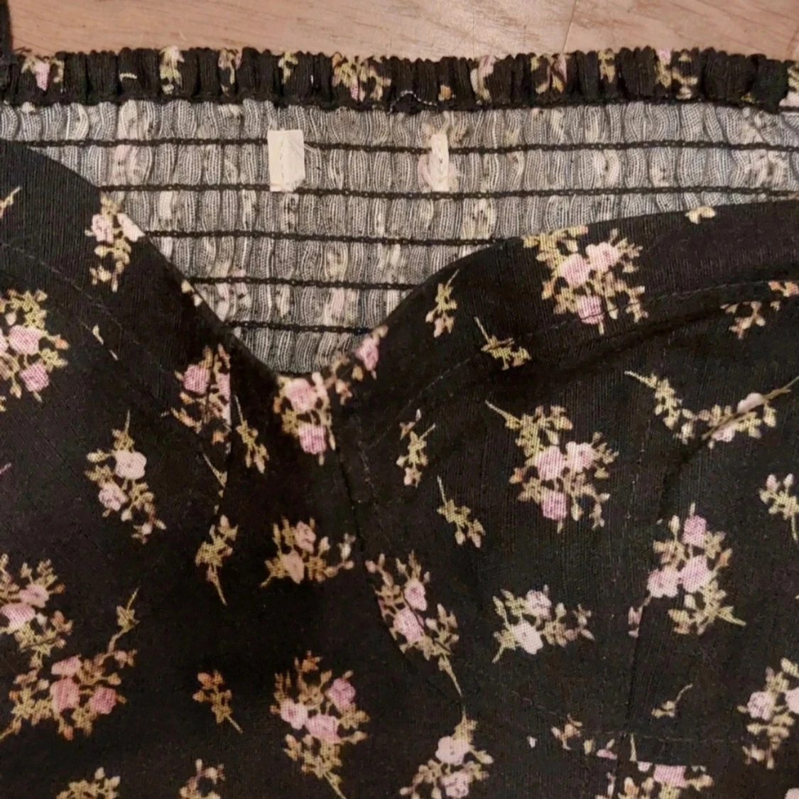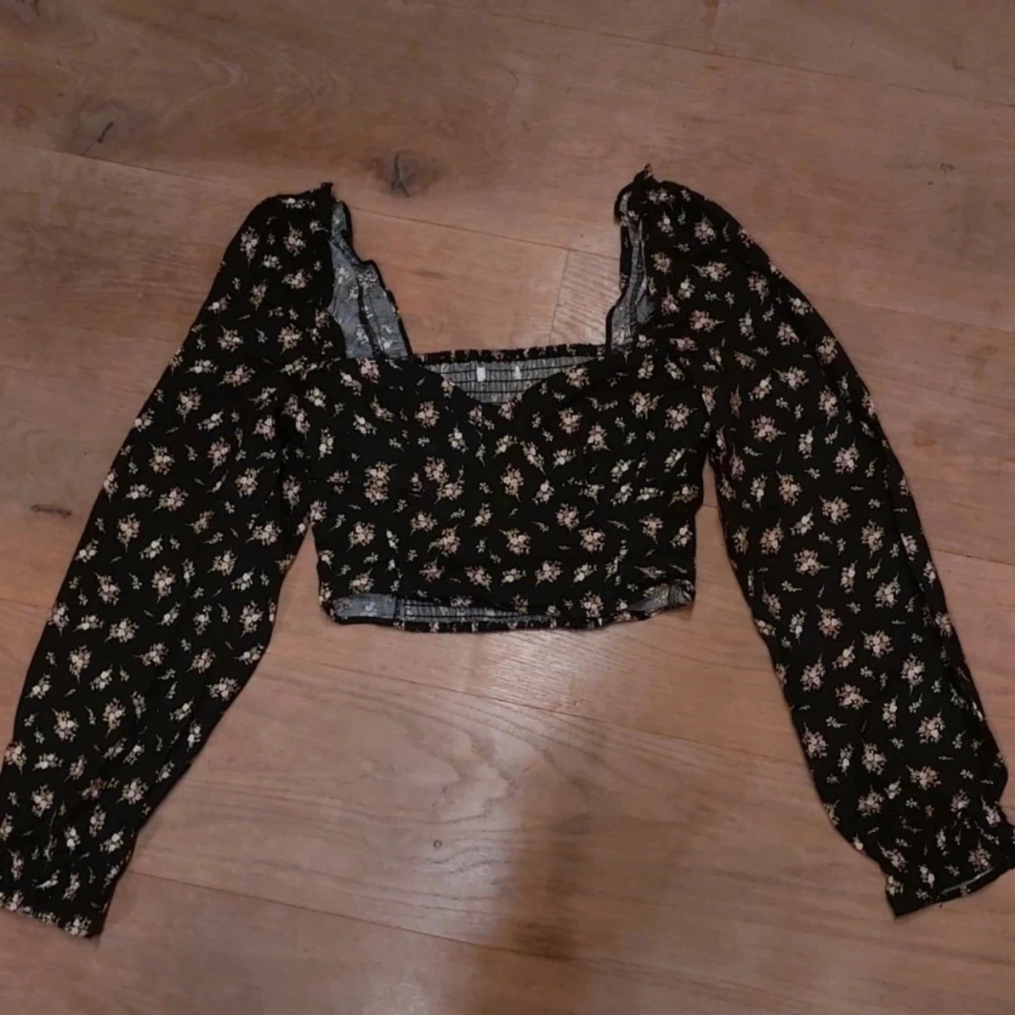 Supersöt svart croppad blus med små blommor i rosa och beige. Toppen har långa puffiga ärmar, smockad rygg och en snygg v-ringning.