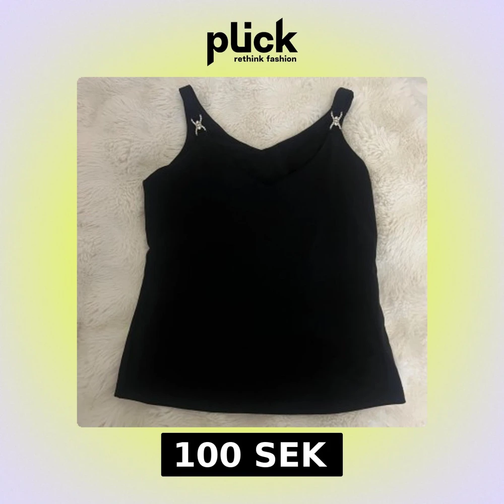 Svart linnetopp från H&M med breda axelband och snygga strassdetaljer på axelbanden. Toppen har en enkel, rak passform och v-ringning framtill. Perfekt för dig som vill ha en stilren men ändå glittrig look.