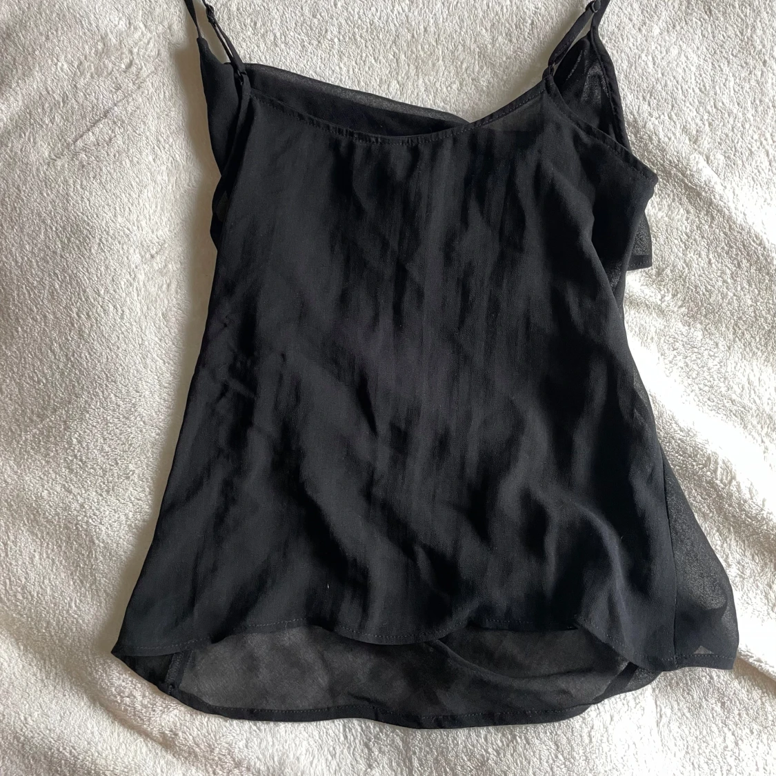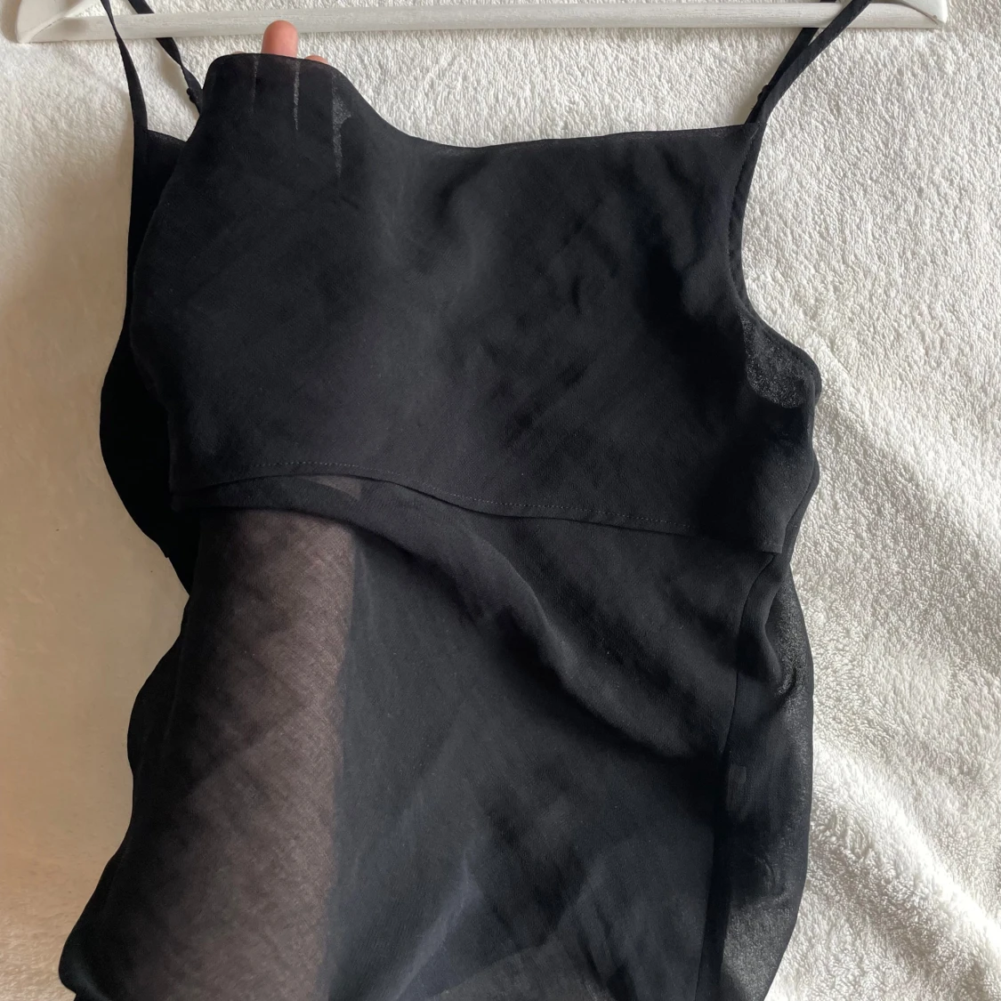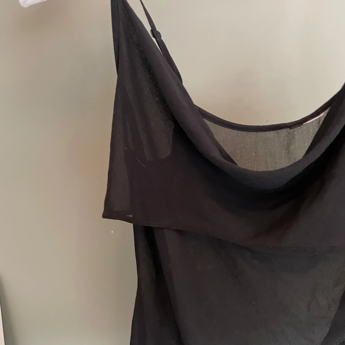 Säljer ett svart, tunnt mesh linnetopp från HM , med smala axelband som går att skjustera. Den har en snygg draperad urringning. Toppen är lätt transparent nertill med upptill har den dubbel tyg. Perfekt för att styla med jeans eller kjol. Enkel men ändå trendig look. Den är xs men linnet är loose i passformen