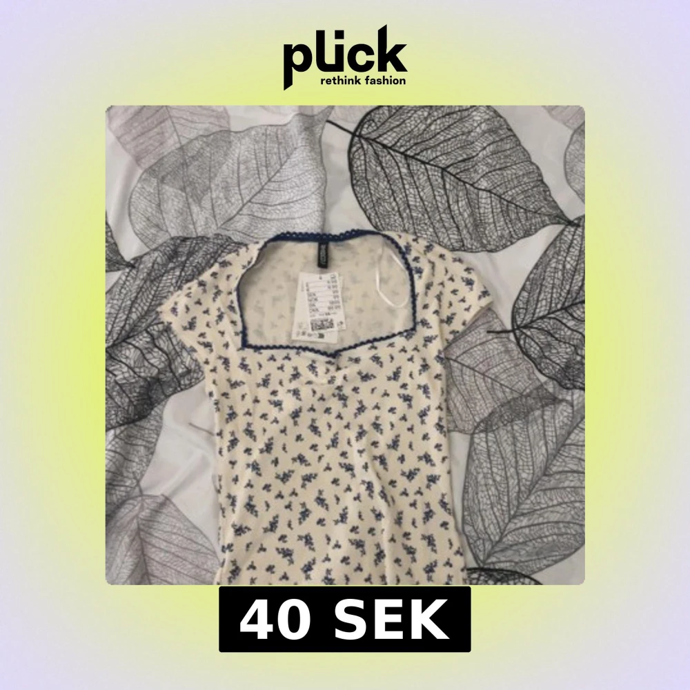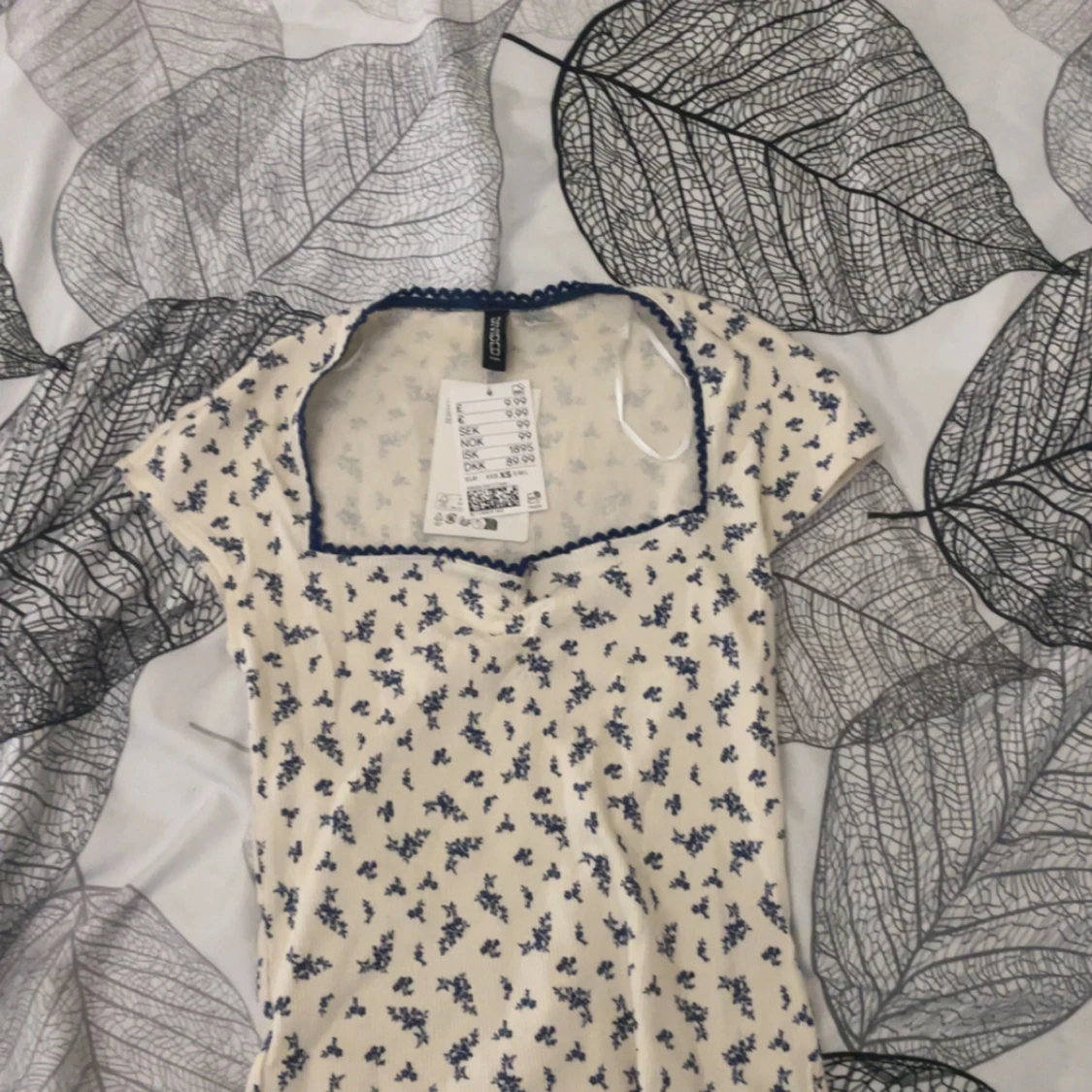 Supersöt topp från hm i ljusbeige med små blå blommor. Toppen har korta ärmar, fyrkantig ringning och blå spetskant runt halsen. Aldrig använt