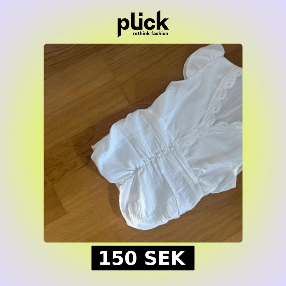 Supersöt vit blus från H&M med v-ringning och spetsdetaljer längs halsen. Blusen har korta volangärmar och smockad midja med små dekorativa knappar framtill. Tunt, lätt tyg som känns luftigt och perfekt för varmare dagar.