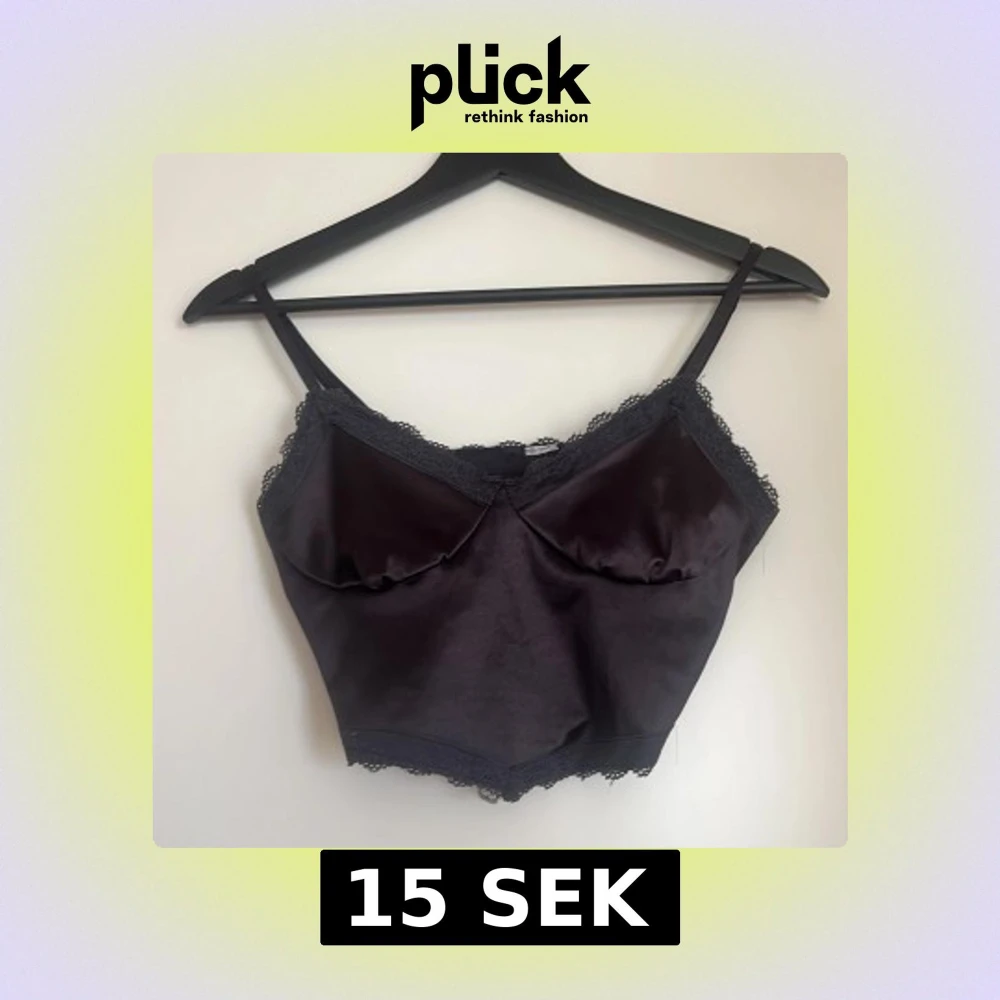 Snygg svart satinlinnetopp med smala axelband och spetsdetaljer längs kanterna.