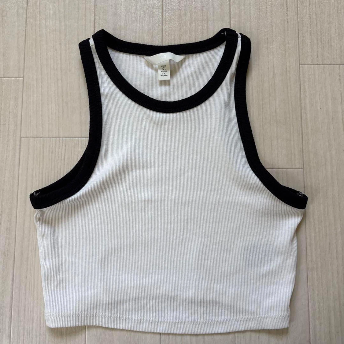Säljer en vit ribbad linnetopp från H&M med svarta kontrastkanter runt hals och ärmhål. Toppen är croppad och har en sportig vibe, perfekt till jeans eller shorts. Enkel och stilren design som passar till många outfits.
