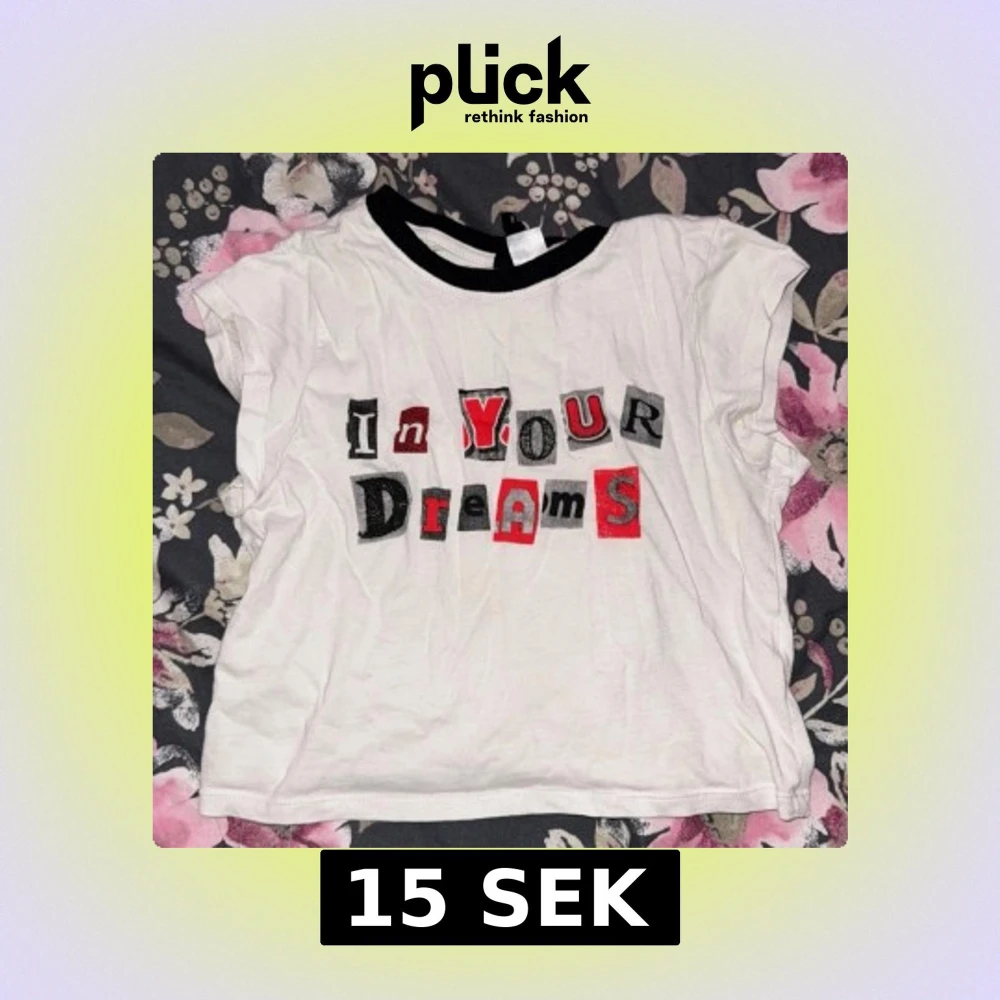 Säljer en vit t-shirt med texten 'In Your Dreams' i olika färger och typsnitt på framsidan. T-shirten har korta ärmar och en svart krage som ger en snygg kontrast. Perfekt för en avslappnad stil.