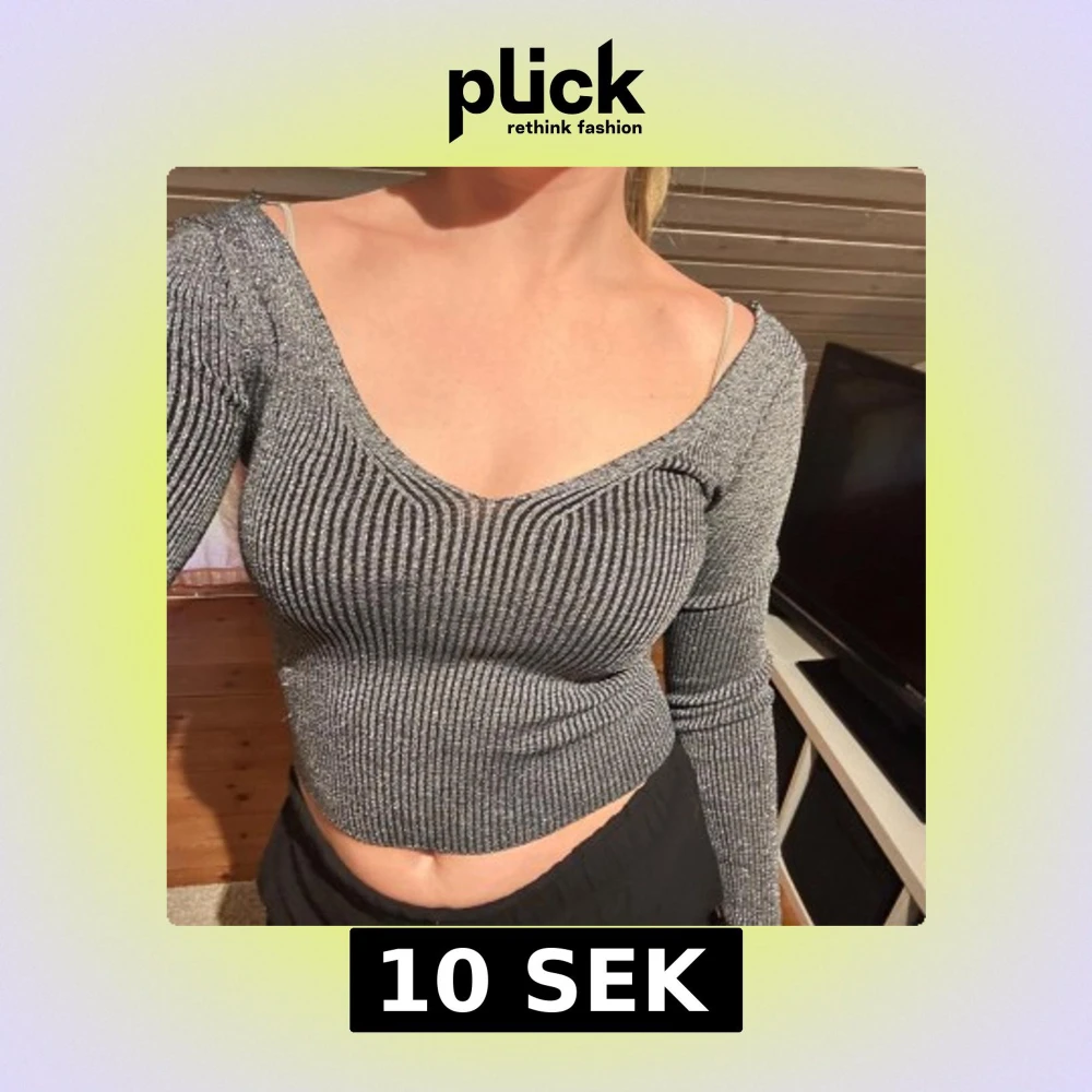 Säljer en glittrig silverfärgad croppad topp med ribbad struktur och v-ringning både fram och bak. Toppen har långa ärmar och sitter tight mot kroppen, perfekt för att sticka ut. Materialet är stretchigt och skimrar snyggt i ljuset. Sömmen har gått sönder lite i ryggen men inget man egentligen ser när man har på sig tröjan✨