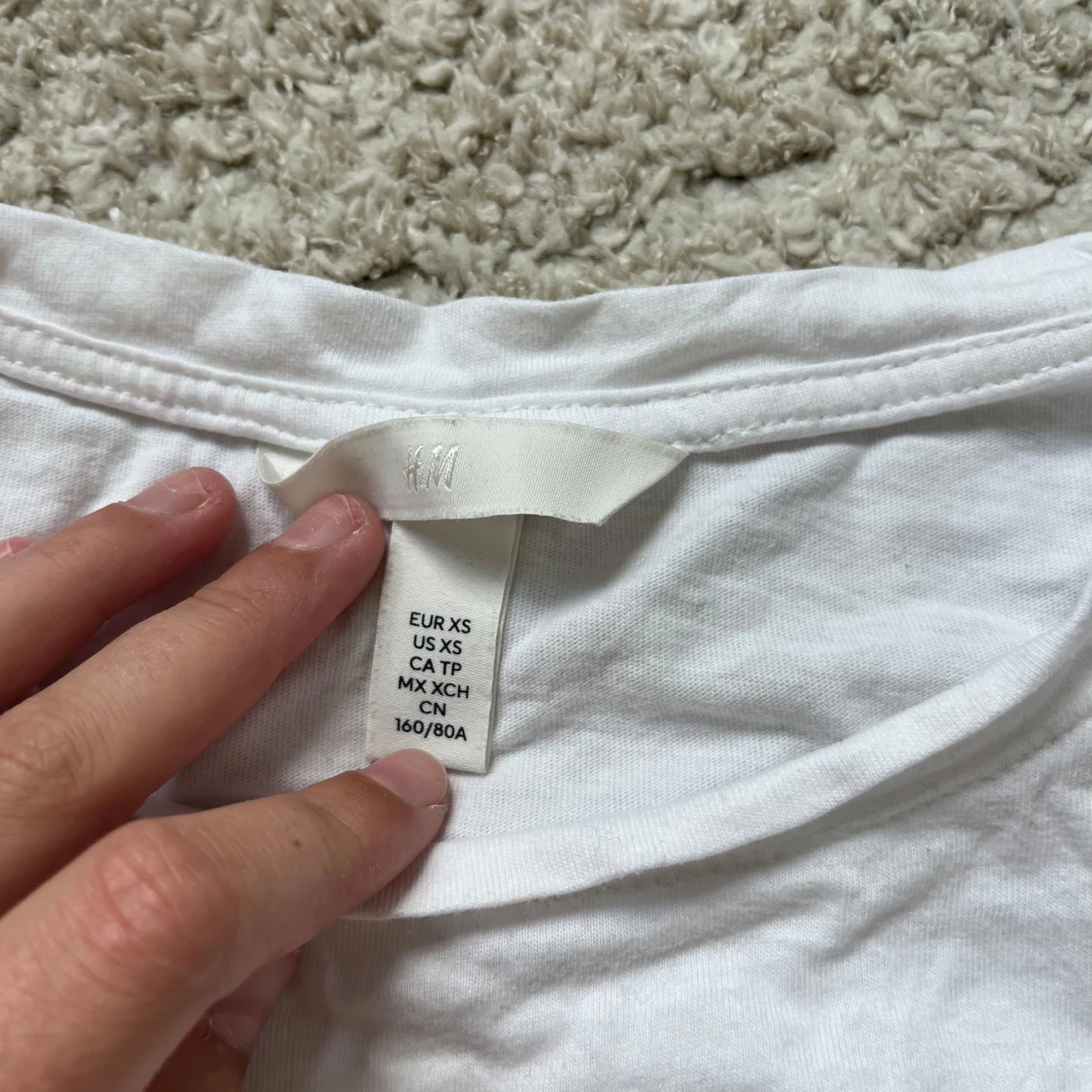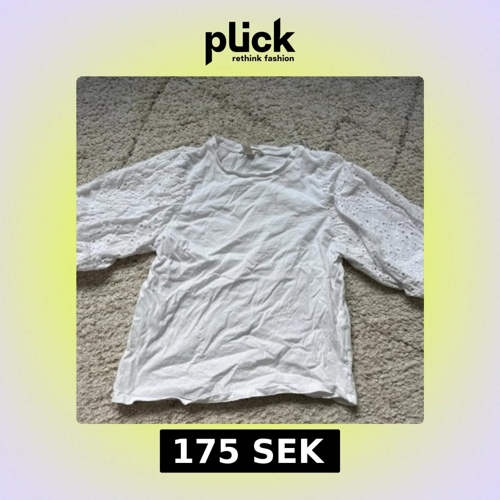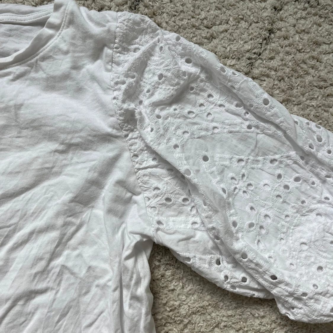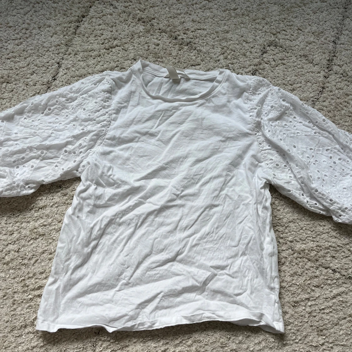 Supersöt vit blus från H&M i storlek XS. Toppen har puffiga, broderade trekvartsärmar med hålmönster och rund halsringning. Perfekt för dig som gillar romantiska detaljer och en fräsch look.