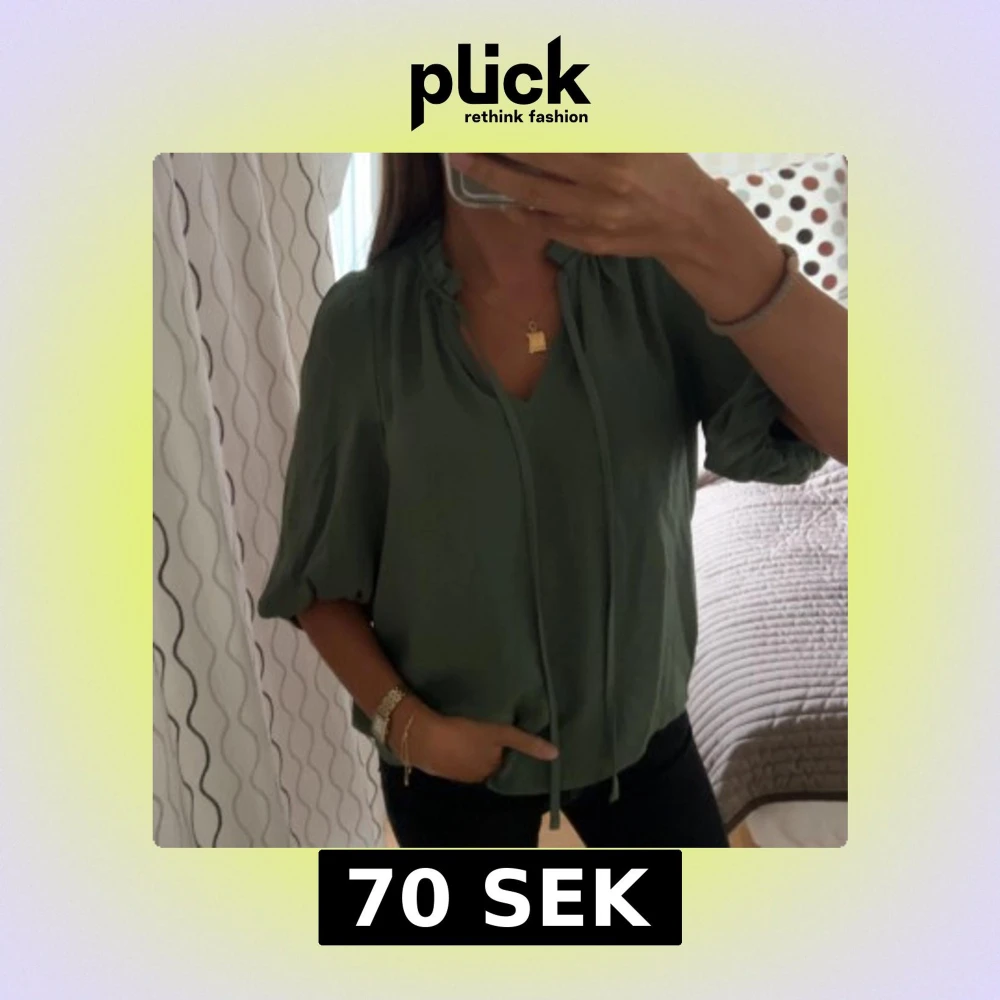Snygg grön blus från Vero Moda med volangdetalj vid halsen och knytband framtill. Blusen har trekvartsärmar med resår vid ärmslut och en avslappnad passform. Perfekt för dig som gillar en chill men ändå stilsäker look.