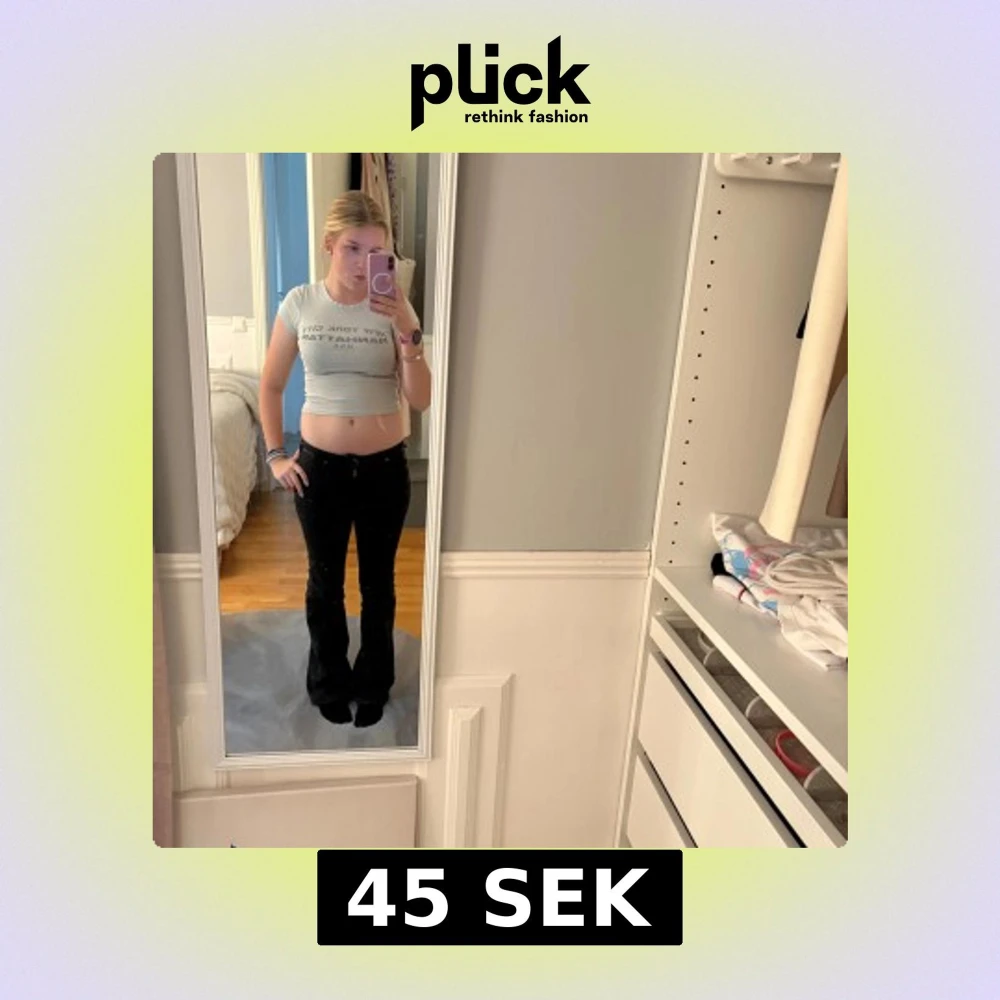 Säljer en grå croppad topp från H&M med tryck 'New York City Manhattan USA' på bröstet. T-shirten har rund halsringning och korta ärmar.