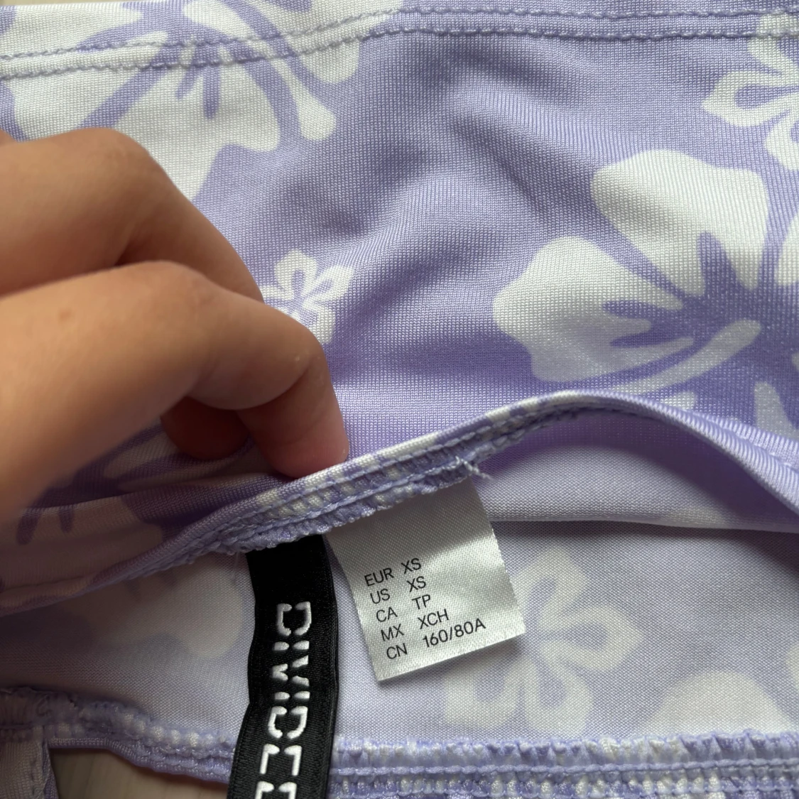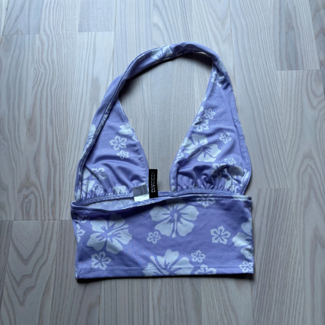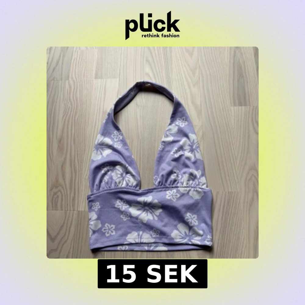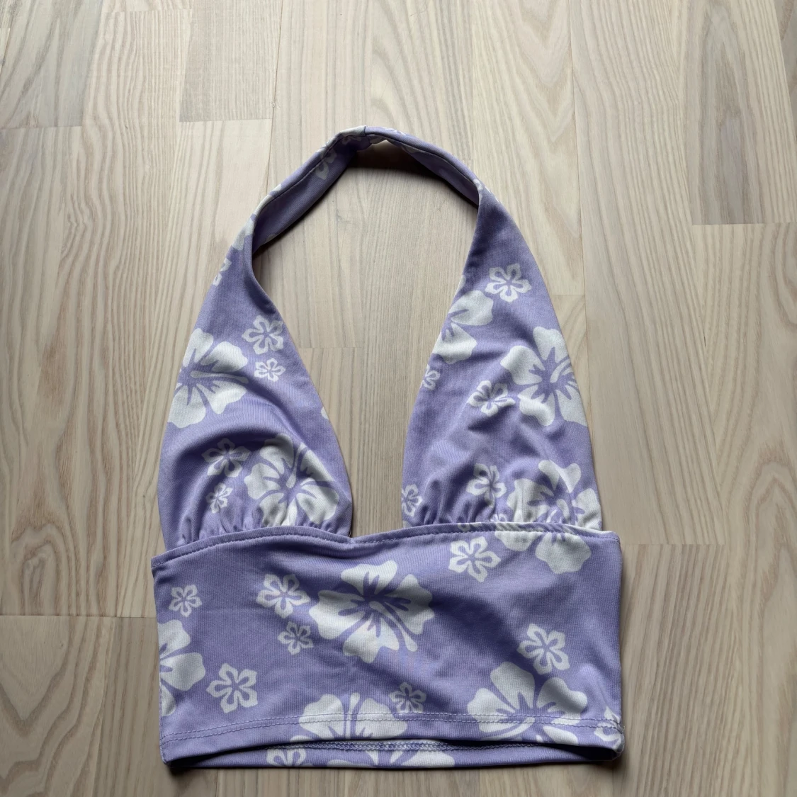 Superfin halterneck tio i lila från HM Divided med stora vita blommor. Halterneck-modell med bred resår under bysten och djup urringning. Skick är jätte svårt att sätta då alla tycker olika, men jag tycker att det är ett mycket bra skick på toppen