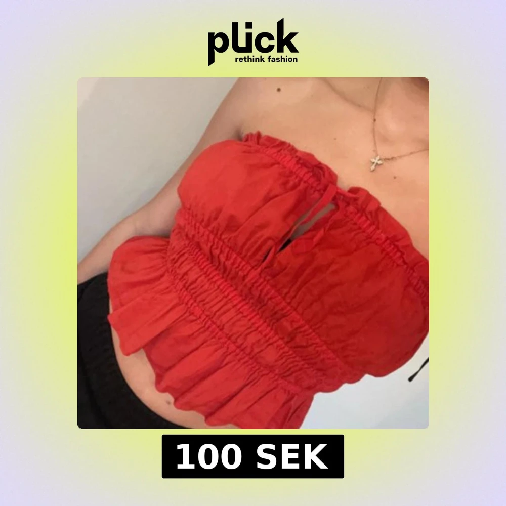 Säljer en röd tubtopp med volangkant och smockade detaljer. Toppen har snörning framtill och är axelbandslös, vilket ger en snygg och trendig look. Materialet känns lätt och passar perfekt till varma dagar. Perfekt för dig som vill sticka ut med färg!