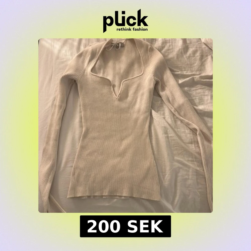 Supersnygg beige ribbad topp från H&M i storlek XS. Långärmad med v-ringning och knytband i halsen som ger en unik touch. Figurnära passform och mjukt material som sitter skönt. Perfekt att styla med jeans eller kjol för en trendig look.