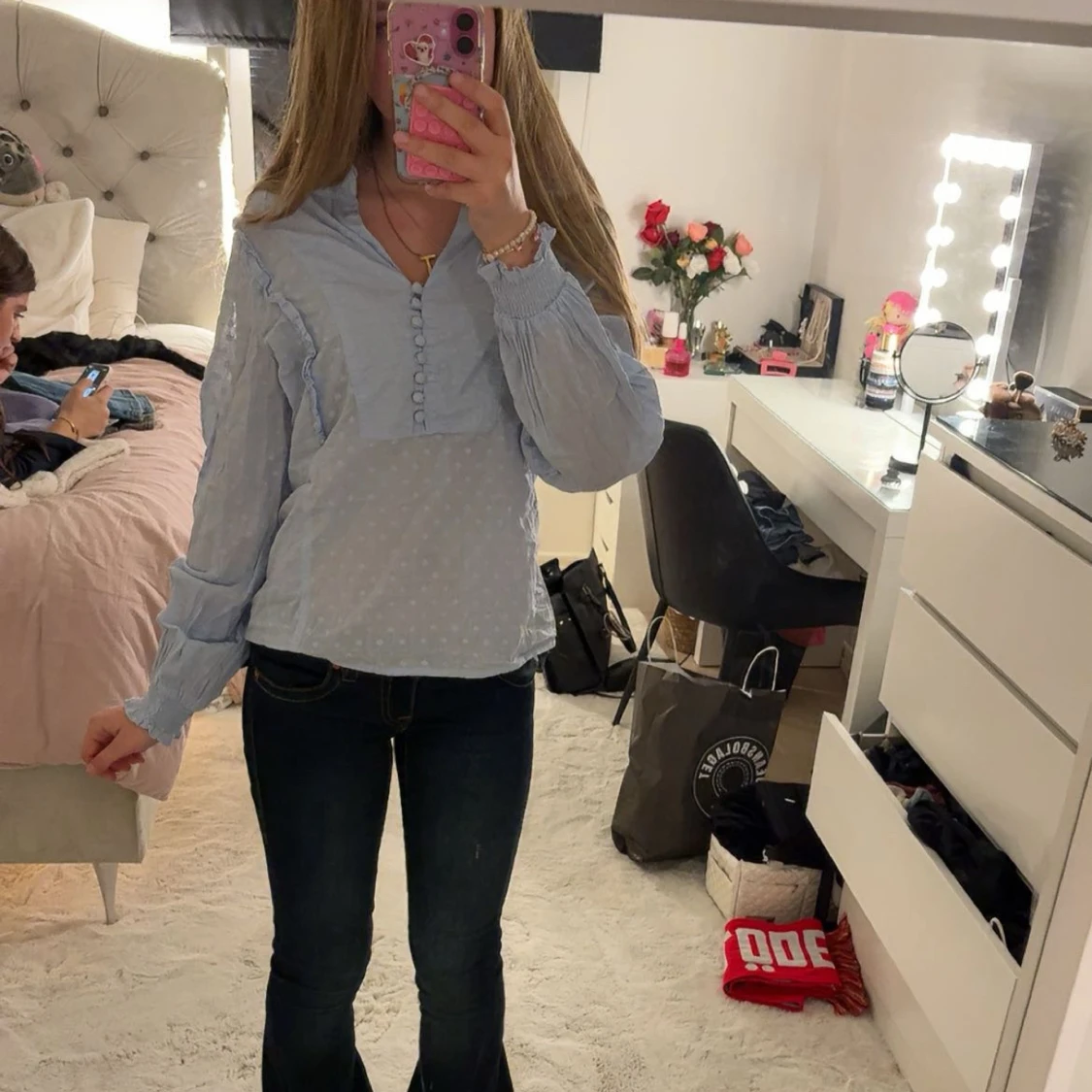 Säljer en söt ljusblå blus med diskreta prickar, volangdetaljer längs axlarna och knappar framtill. Blusen har långa puffärmar med smock vid ärmslut och v-ringad hals. Från h&m