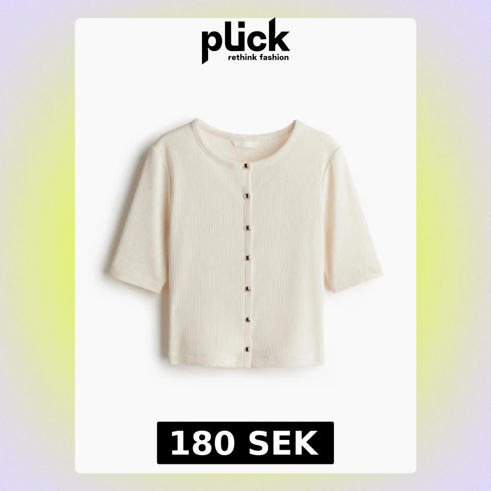 Snygg Crémevit ribbad topp från H&M med korta ärmar och rund halsringning. Toppen har dekorativa knappar framtill och är croppad i modellen. Perfekt att styla med jeans eller kjol för en trendig look