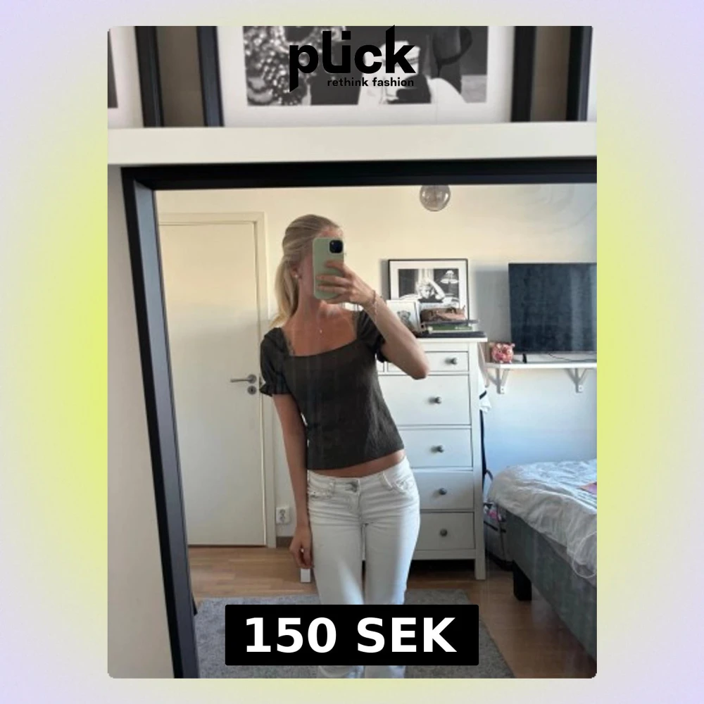 Säljer en mörk grön blus med fyrkantig halsringning och korta puffärmar. Toppen är croppad och har en slim passform som framhäver figuren. Perfekt för dig som gillar stilrena och trendiga plagg.