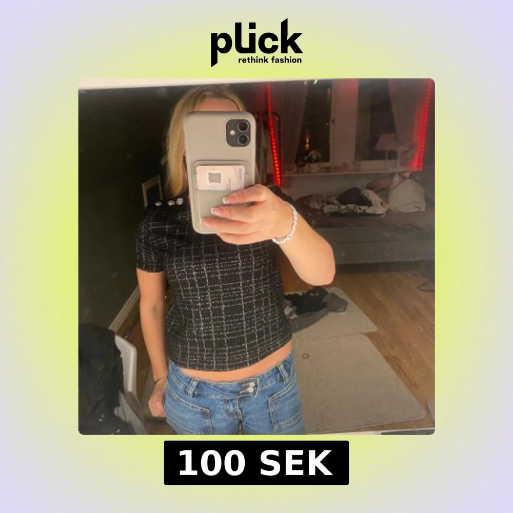 Säljer en svart rutig blus från H&M med kort ärm och tre stora silvriga dekorationsknappar på ena axeln. Toppen har en boxig passform och är tillverkad i ett lite grövre tyg med vit tråd i rutmönster. Perfekt för dig som gillar en chic och trendig look.