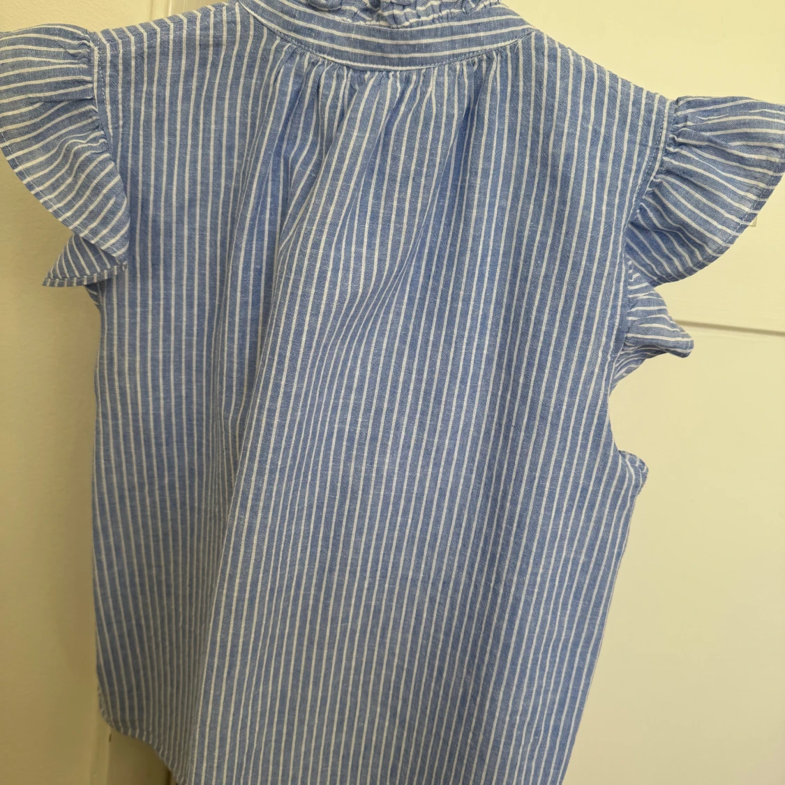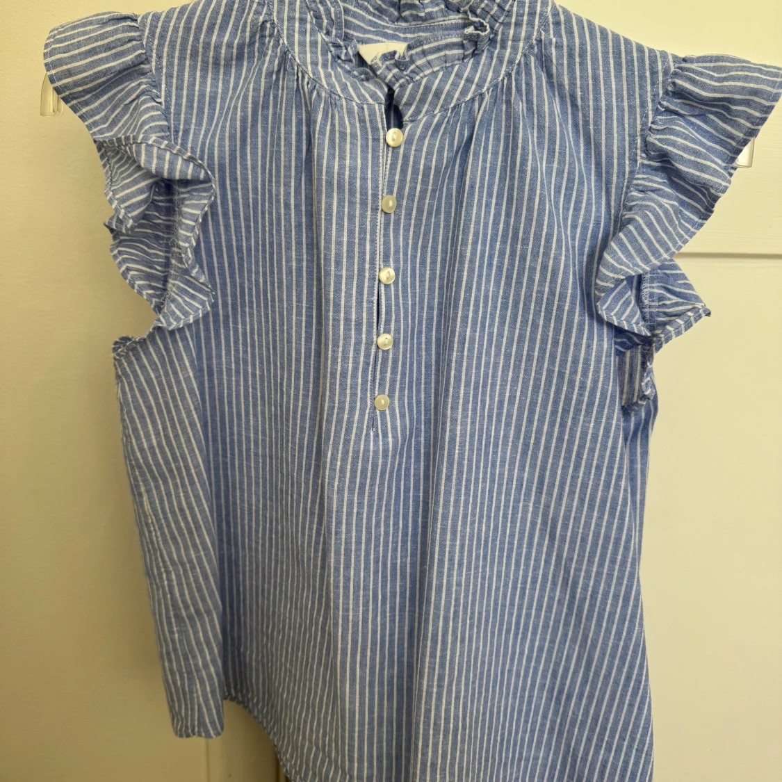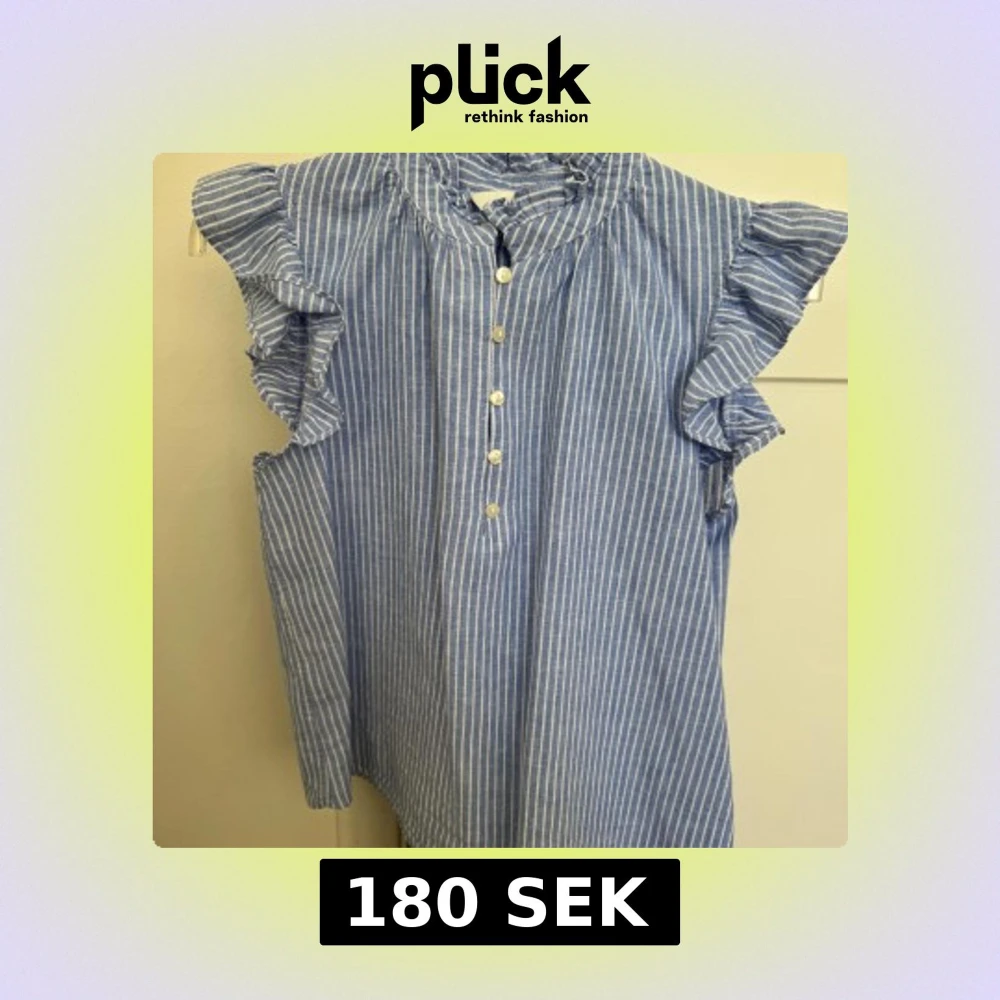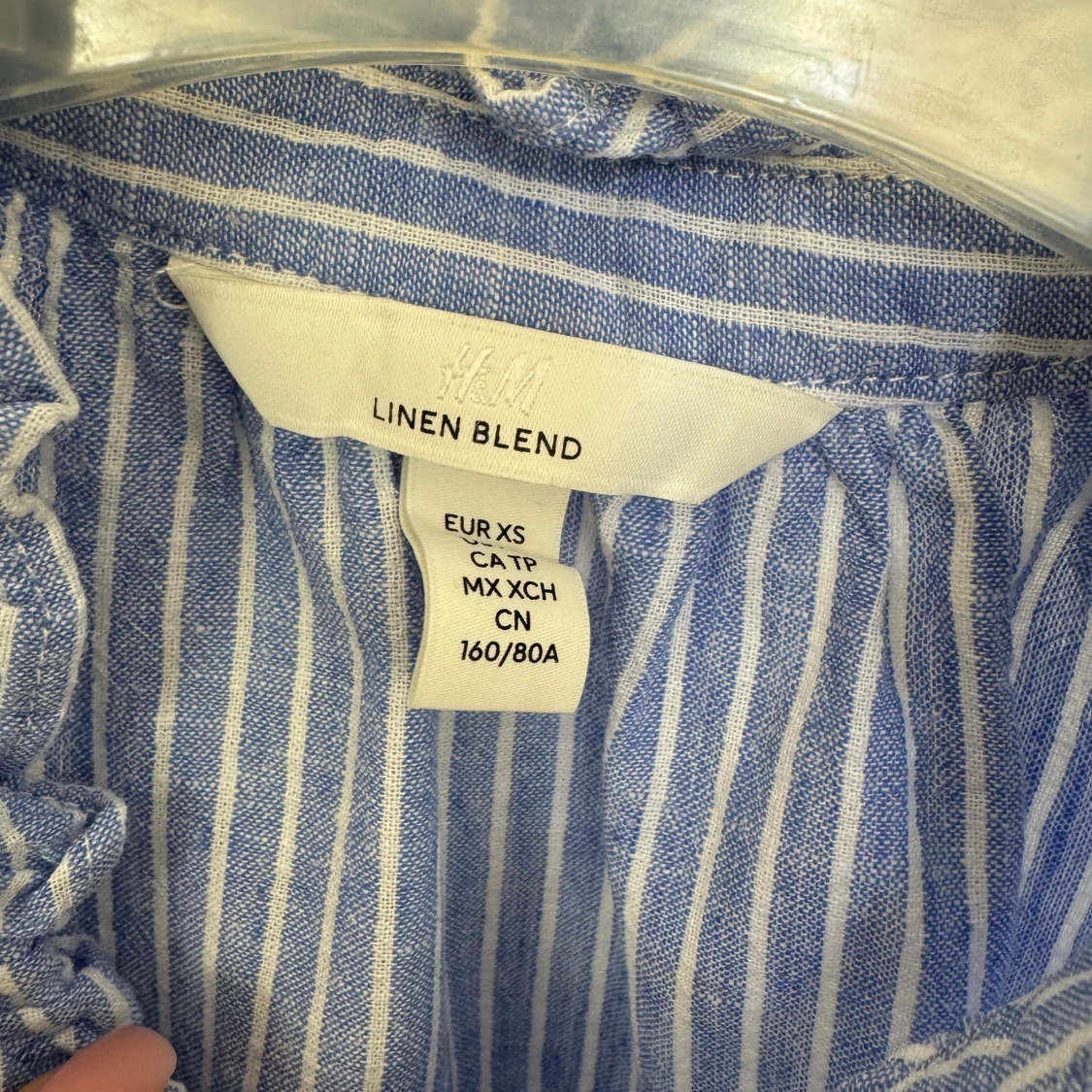 Supersöt blå och vit randig blus från H&M i linneblandning. Blusen har volangärmar, liten ståkrage med rynk och knappar framtill.