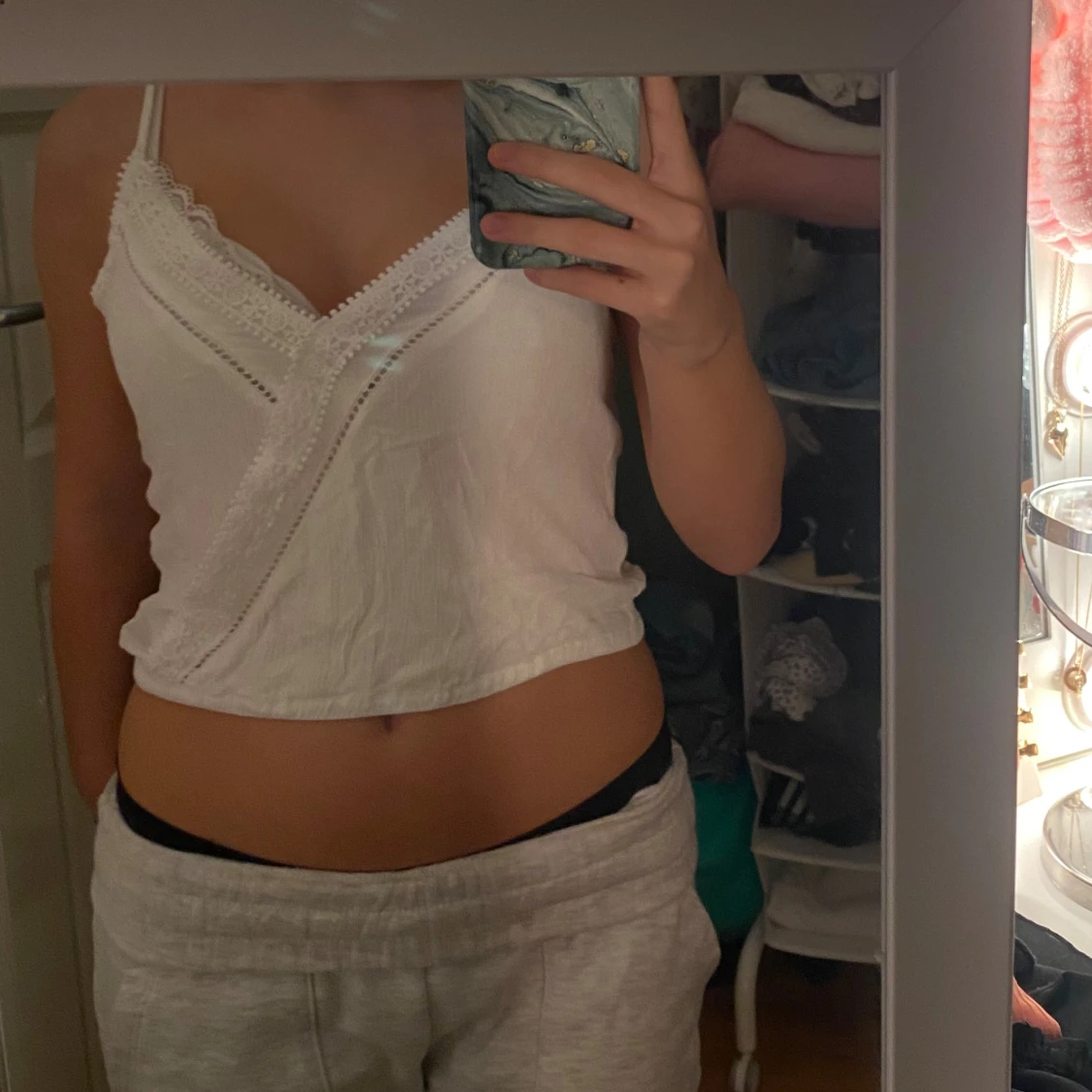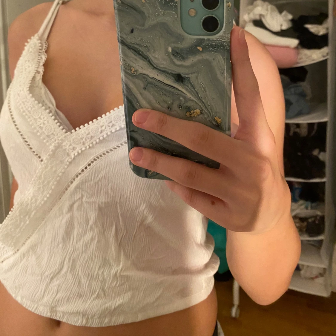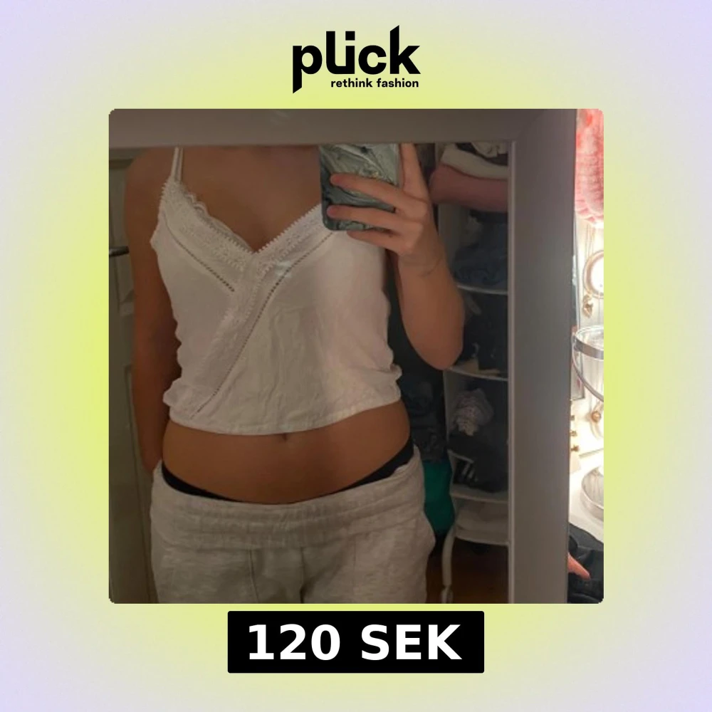 Säljer en söt vit linnetopp med omlott-design och tunna axelband. Toppen har fina spetsdetaljer längs v-ringningen och dekorativa sömmar framtill. 💗💗