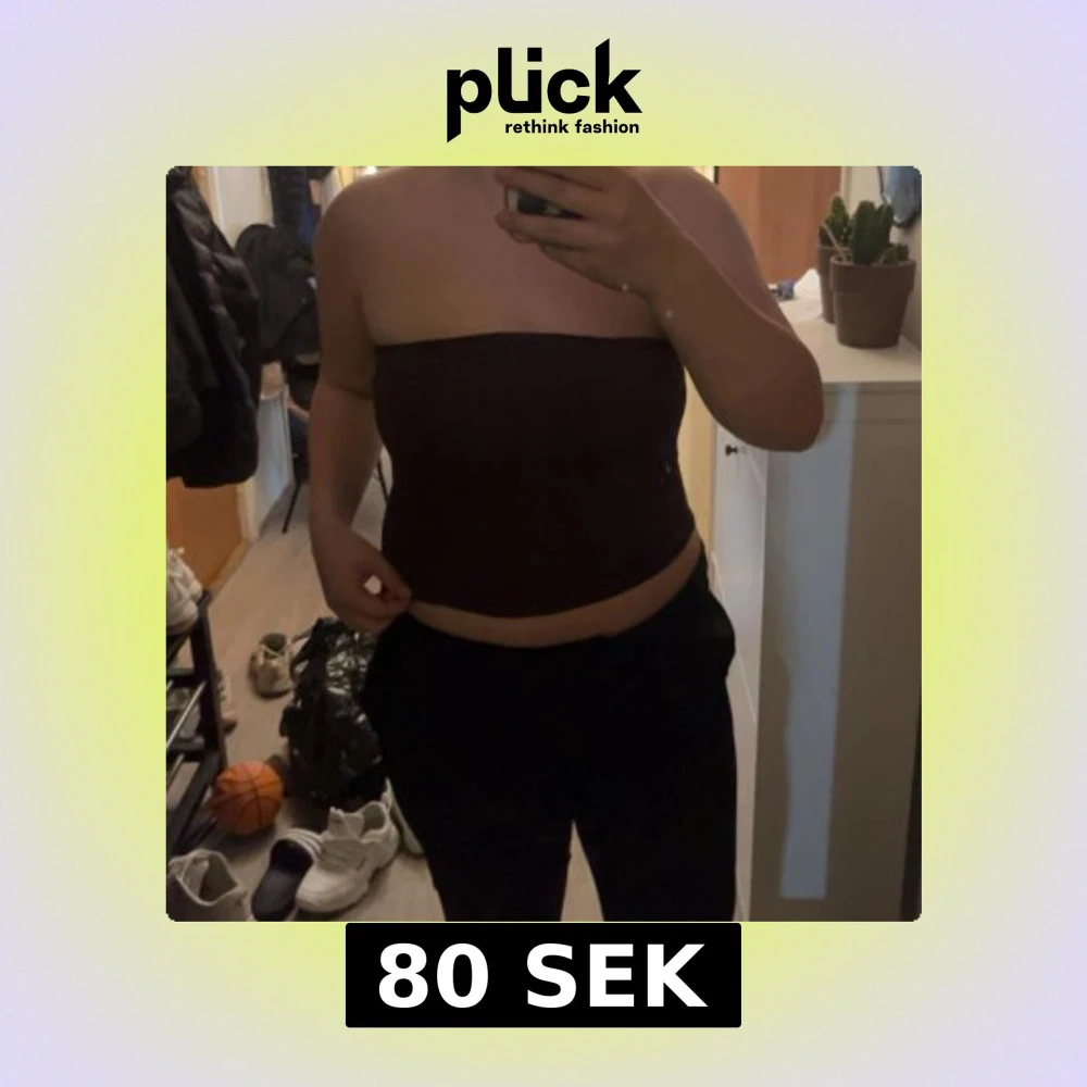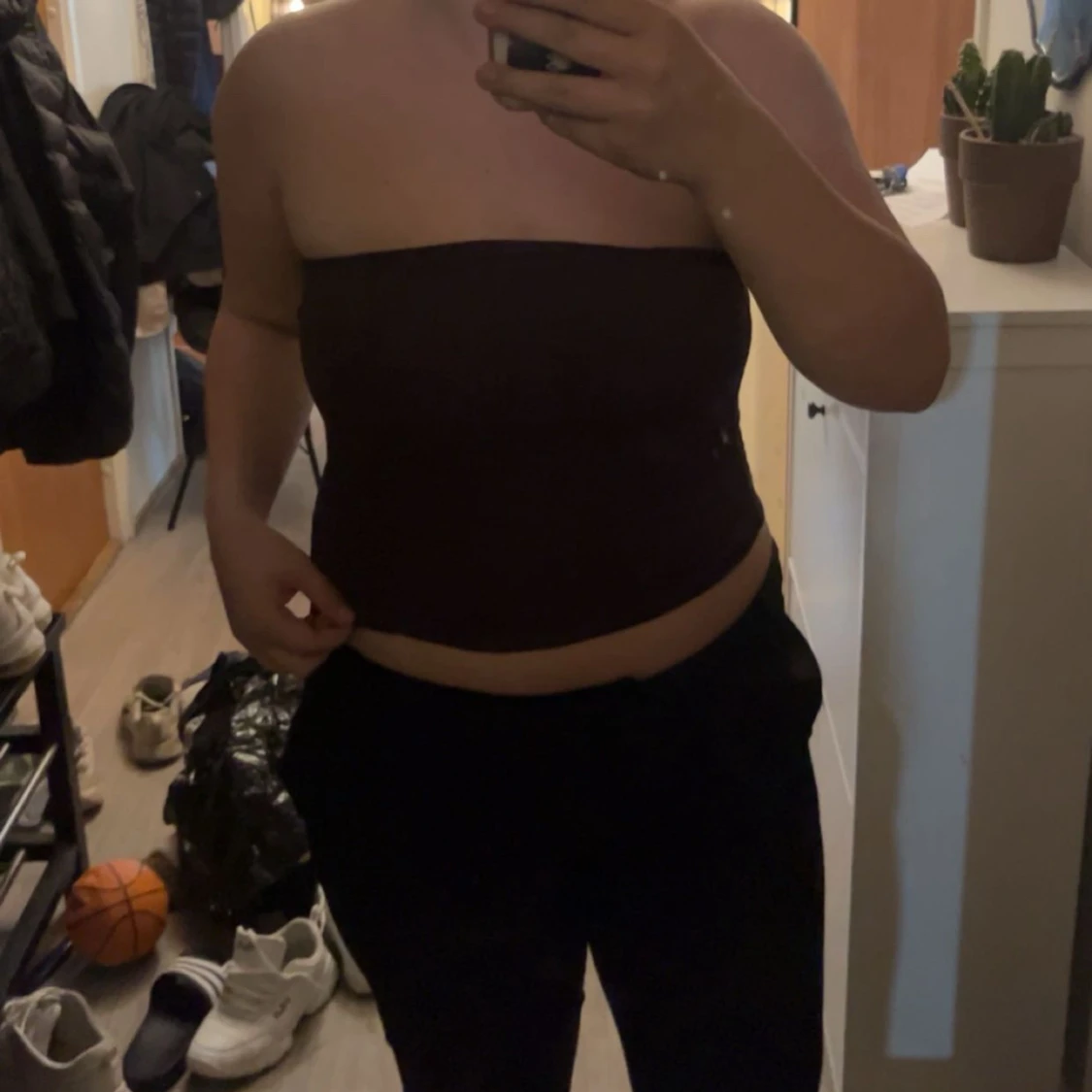 Säljer en stilren mörkbrun bandeau tubtopp som sitter tight och har en enkel, rak form. Toppen är axelbandslös och passar perfekt för dig som gillar minimalistisk stil. Materialet känns mjukt och stretchigt mot huden.
