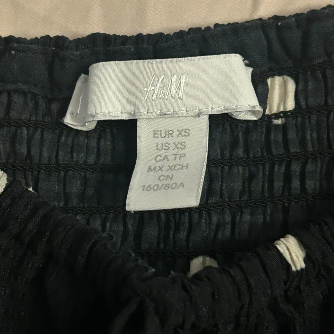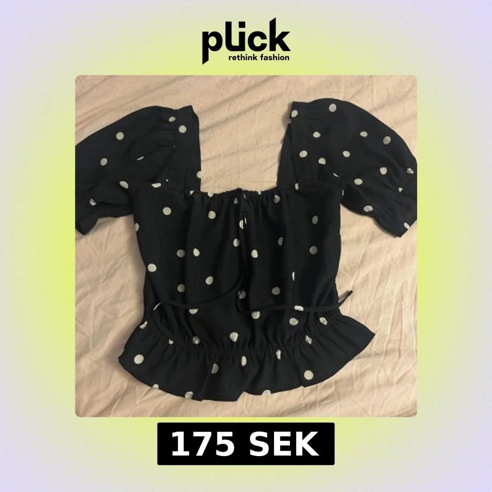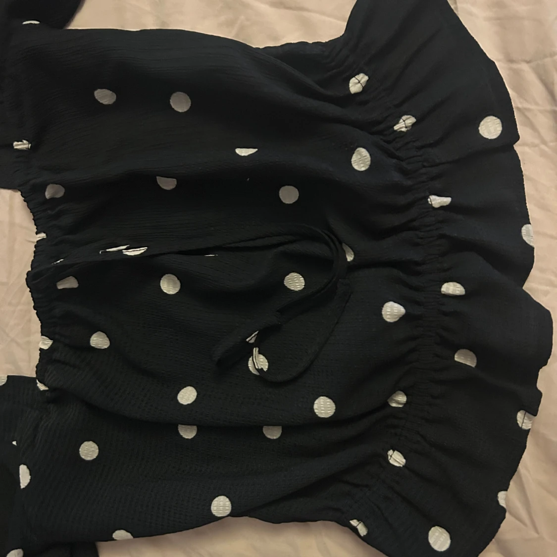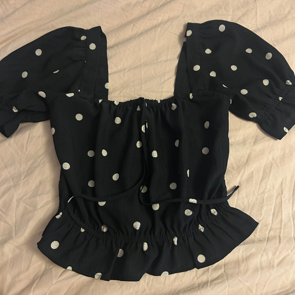 Supersöt svart blus från H&M i storlek XS med vita prickar. Modellen har puffiga korta ärmar, smockad i midjan! ❤️!!!!välj postnord när du beställer inte instabox!!