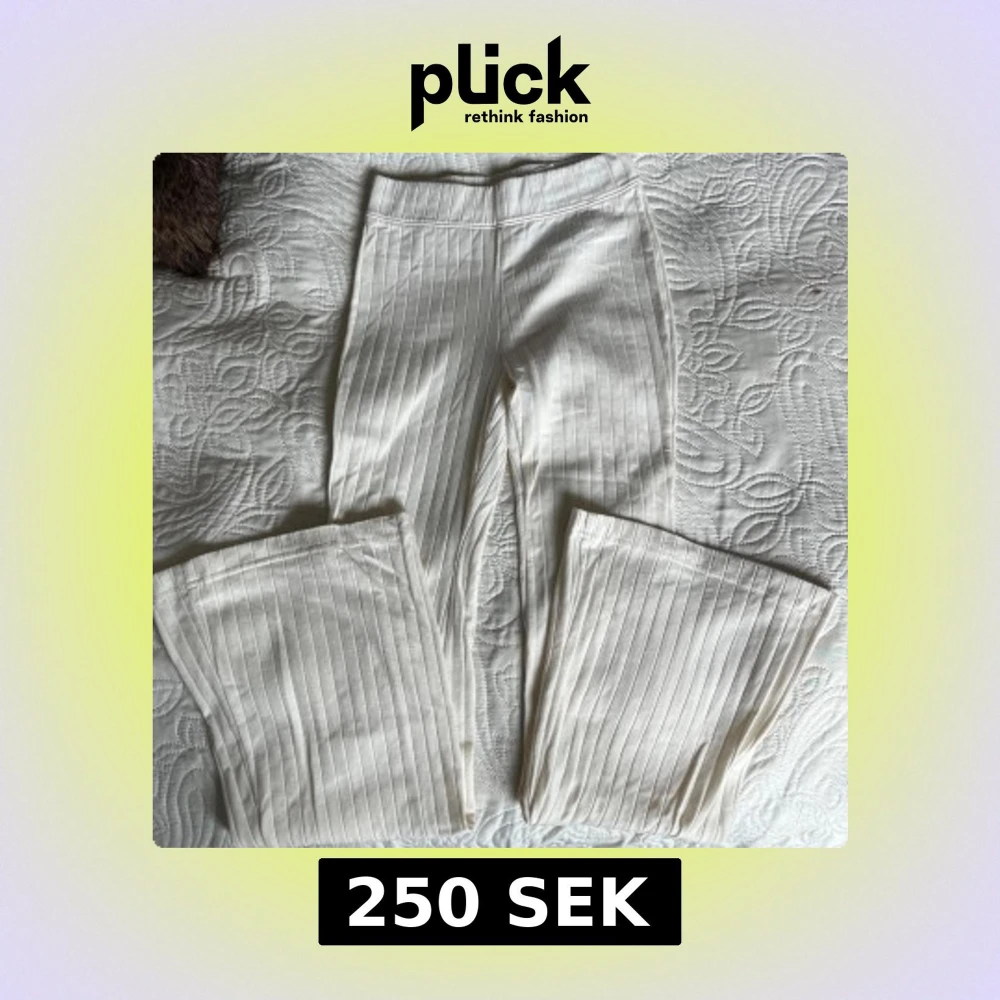 Säljer ett cremevitt ribbat set med en cropped huvtröja, linne med v-ringning och utsvängda byxor. Settet är från H&M och har knappt använts. Allt är i samma färg, det är bara ljuset som får det att se lite olika ut.