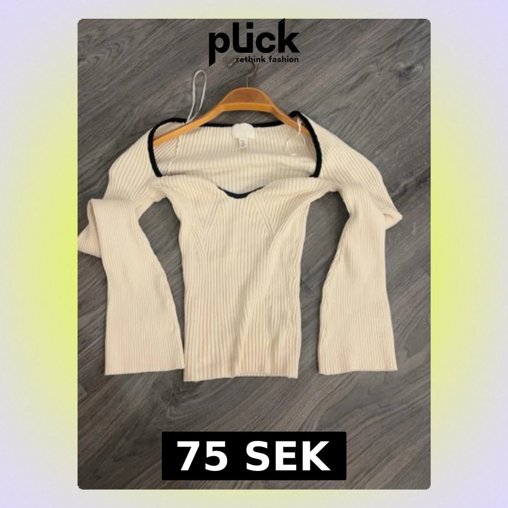 Trendig ribbad offshoulder topp från H&M i ljusbeige med svarta kontrastkanter. Toppen har lång ärm och en snygg v-ringad skärning framtill. Perfekt för dig som gillar en stilren men ändå unik look.
