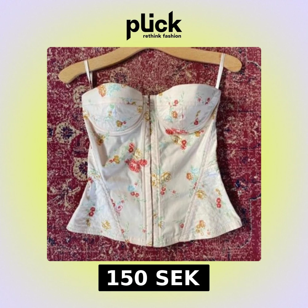 Säljer en ljus korsett med blommigt mönster i rött, gult och grönt. Toppen har formade kupor, smala axelband och markerad midja. Perfekt för dig som gillar romantisk och feminin stil. Stängning framtill och lätt utsvängd nederkant.