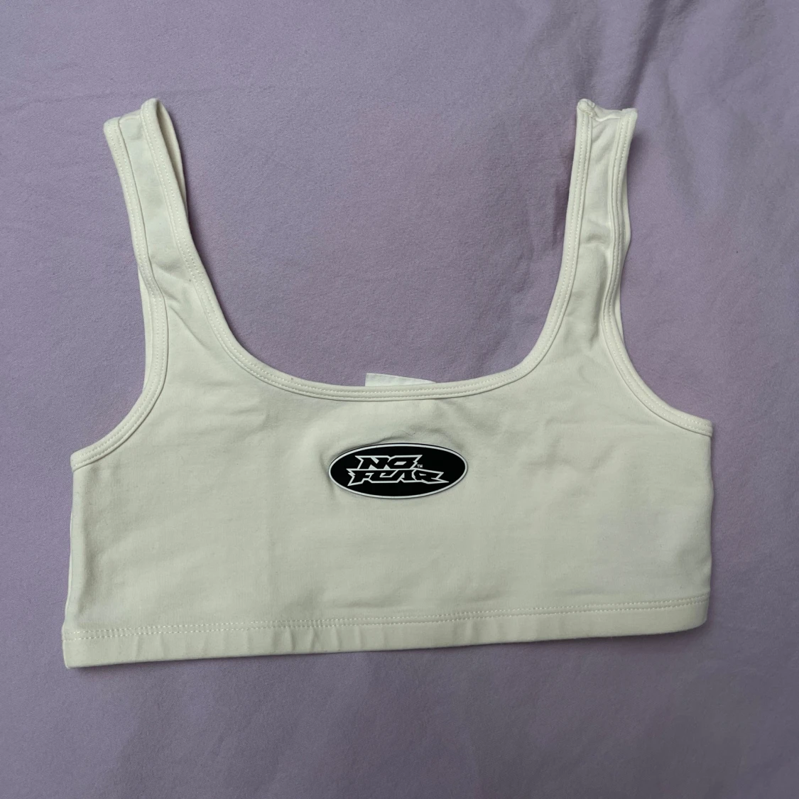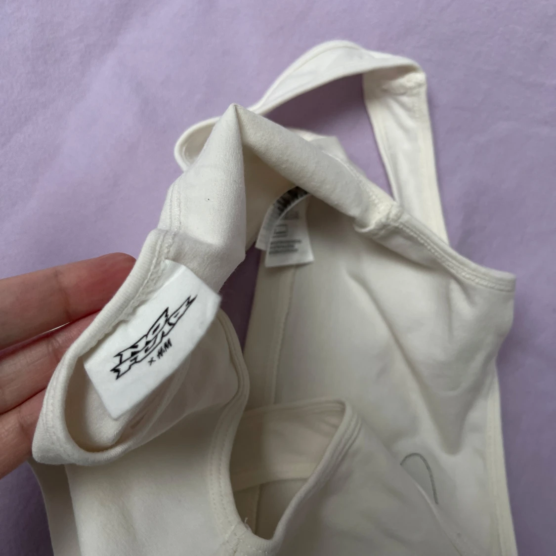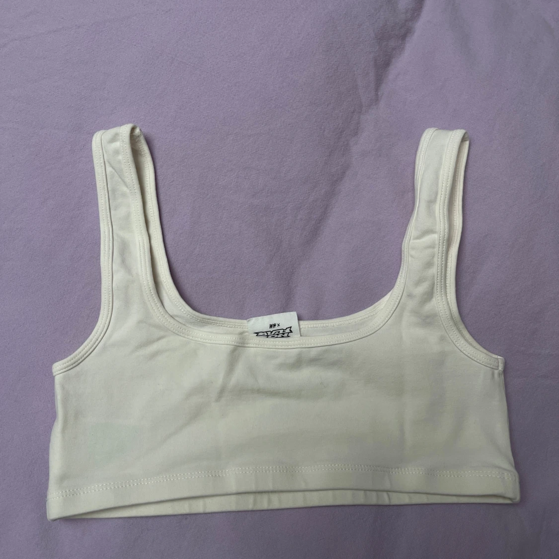 Säljer en vit topp från h&m med breda axelband och ett tryck framtill. Perfekt för en avslappnad stil. Toppen är i ett mjukt och bekvämt material.