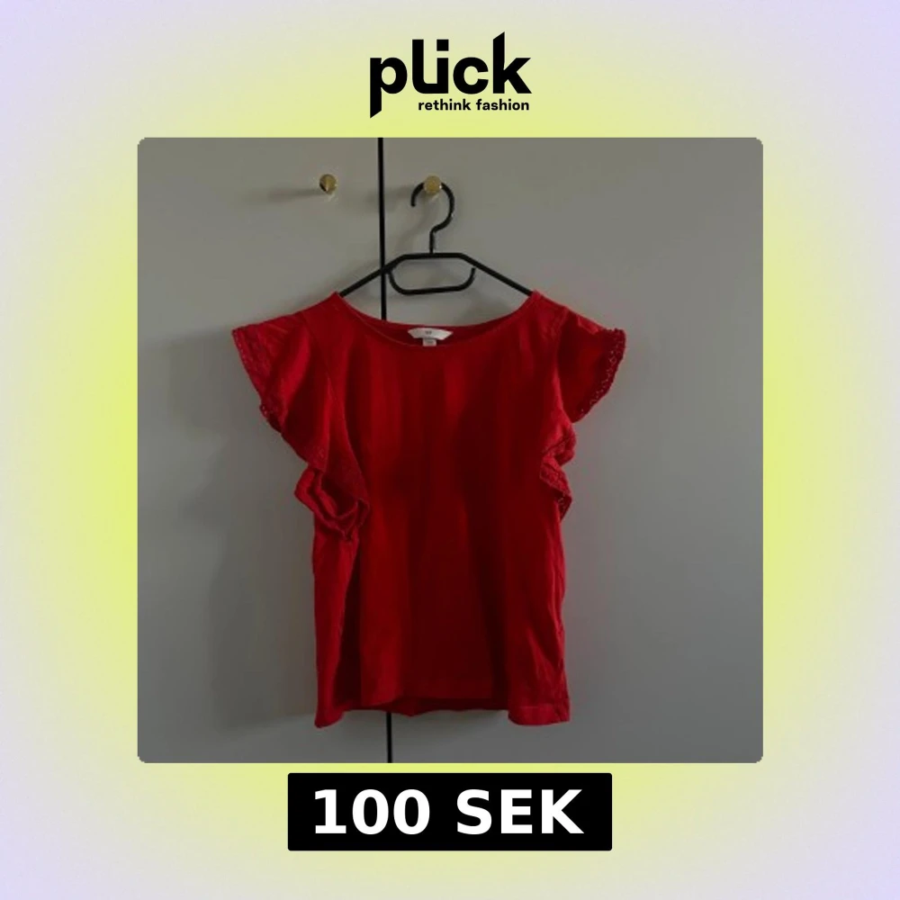 Säljer en röd topp med spetsdetaljer på ärmarna. Toppen har en lös passform och korta ärmar med volang. Perfekt för en somrig look!