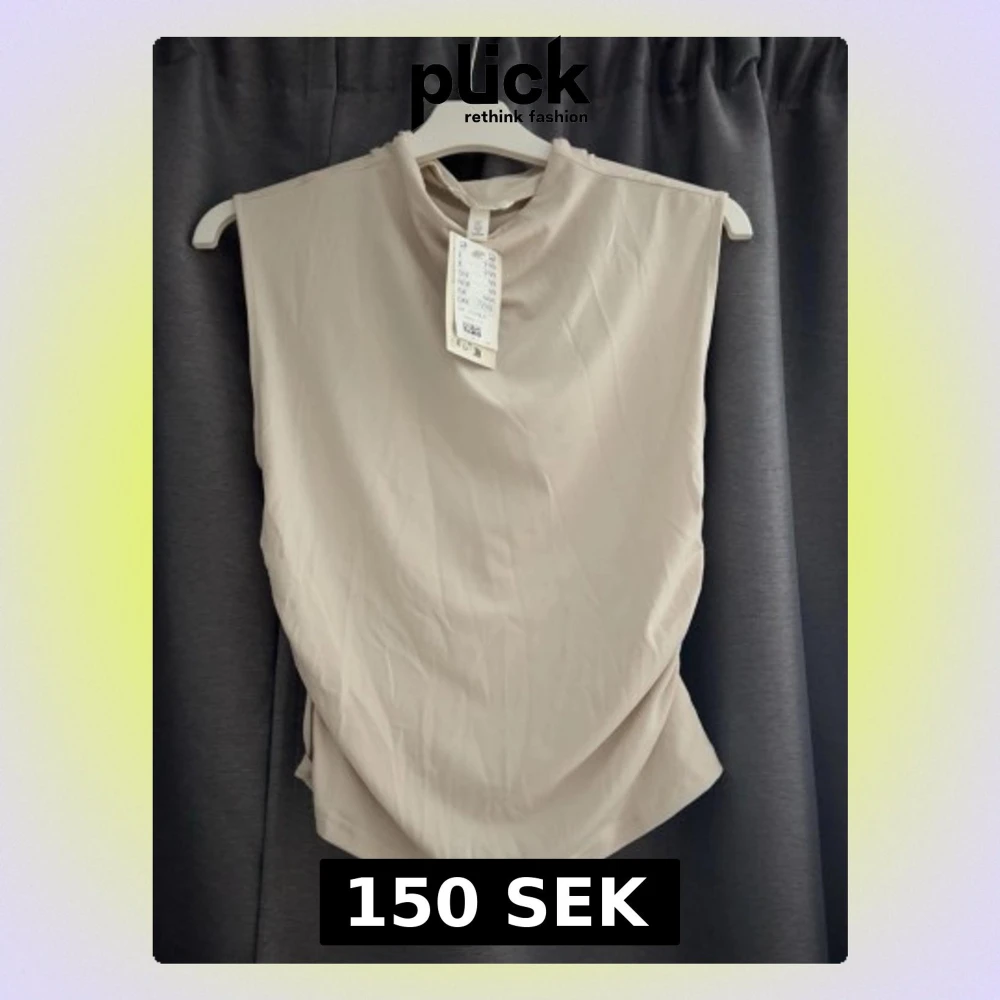 Stilren beige ärmlös topp från H&M med hög hals och snygg rynkdetalj på sidan. Tillverkad i mjuk polyester som ger en skön känsla och lätt glans. Perfekt att matcha med jeans eller kjol för en trendig look.