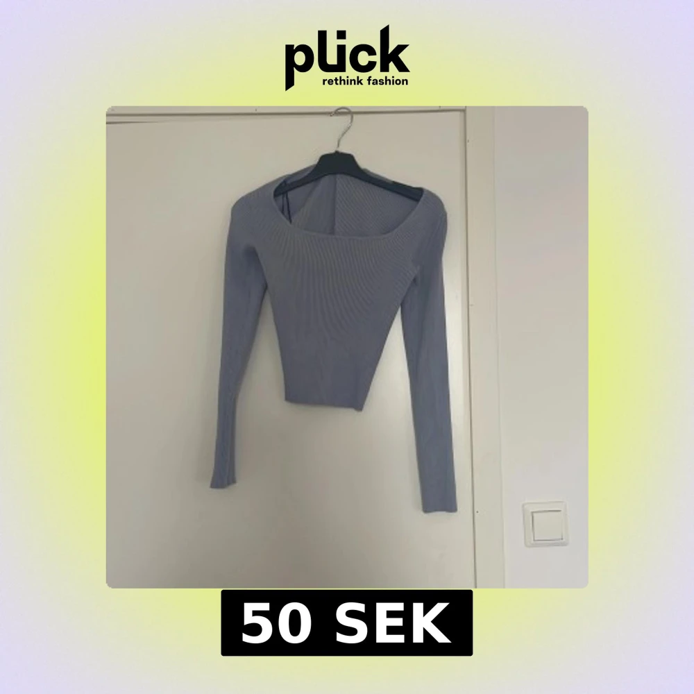Säljer en ljusblå ribbad topp med lång ärm och croppad passform. Toppen har en bred, rundad urringning och är tillverkad i ett stretchigt matrial.
