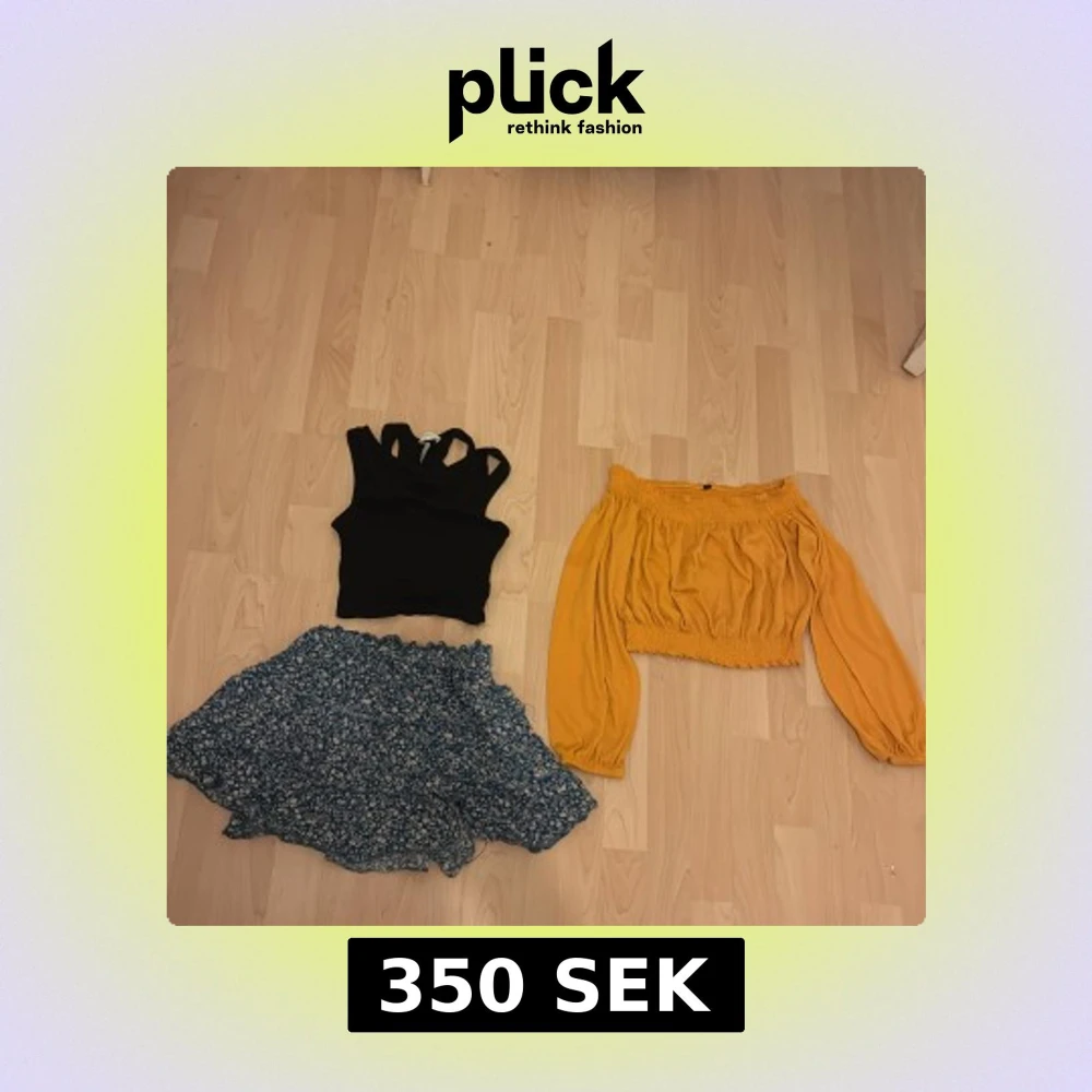 Säljer en stilren svart ribbad topp med breda axelband och en senapsgul offshoulder blus med långa ärmar och elastisk midja. Perfekt för att mixa och matcha i garderoben! Säljer även en blommig kjol.