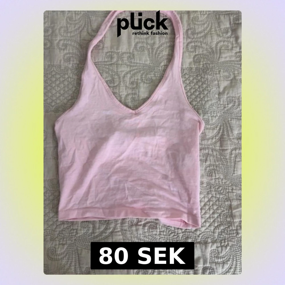 Säljer en ljusrosa croppad linnetopp med v-ringning och halterneck. Toppen är ärmlös och gjord i mjuk bomull, perfekt för varma dagar. Enkel och stilren design som passar till mycket.