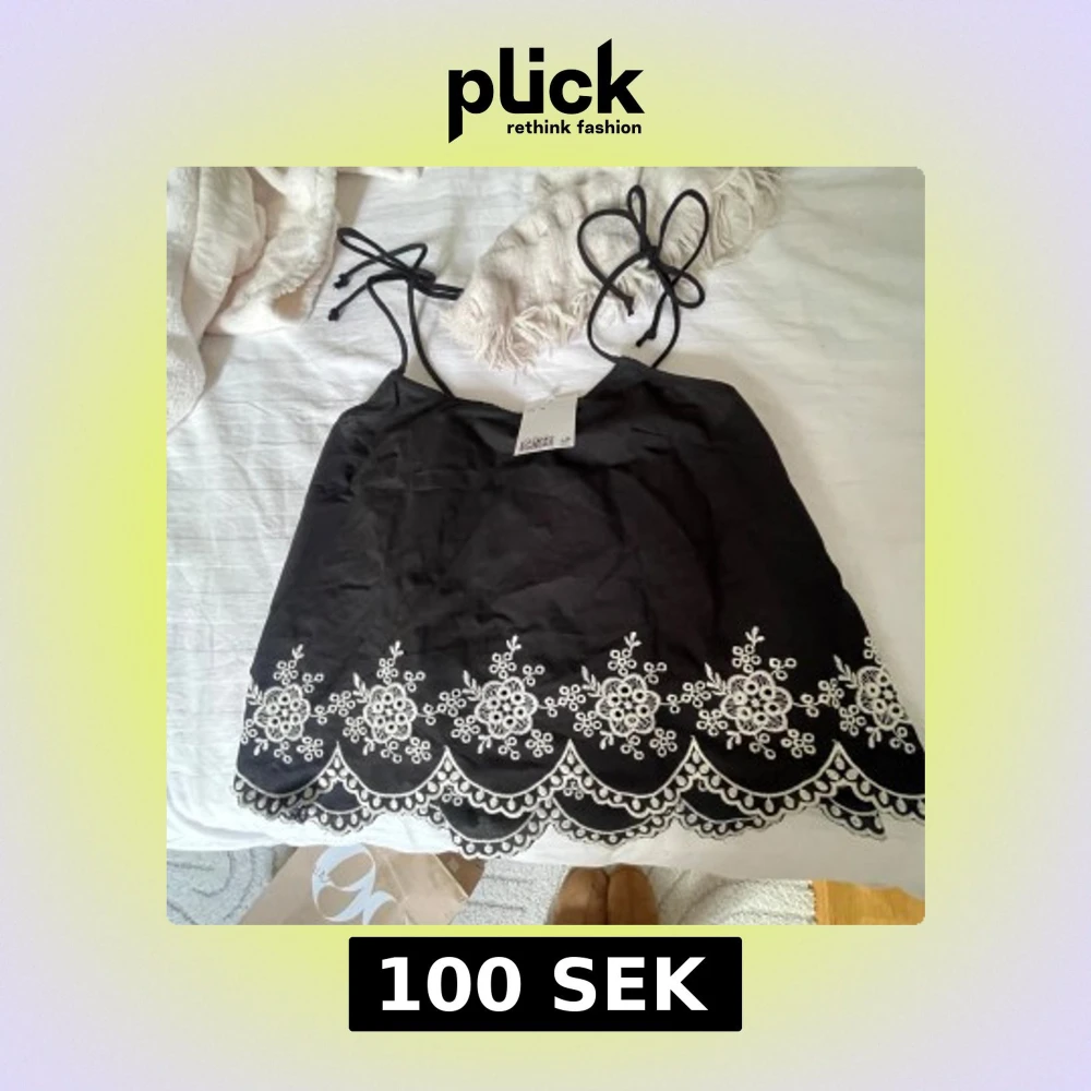 Supersöt svart linnetopp med tunna axelband som knyts på axlarna. Nedtill har toppen vit broderad spets i blommigt mönster och vågig kant. Perfekt för en somrig look och lätt att matcha med jeans eller kjol.
