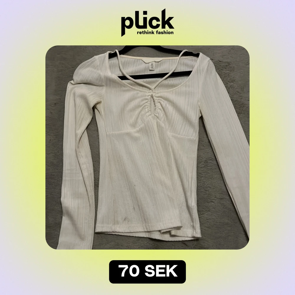 Säljer en stilren vit ribbad topp från H&M. Den har långa ärmar och en snygg v-ringad design med knytning framtill. Perfekt för både vardag och festliga tillfällen. Passar bra till jeans eller kjol för en chic look!