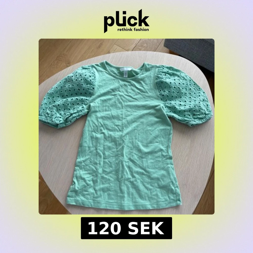Superfin mintgrön blus från H&M i storlek XS. Toppen har korta puffärmar i broderad bomull med hålmönster och rund halsringning. Perfekt för dig som gillar unika detaljer och en fräsch färg till våren eller sommaren.