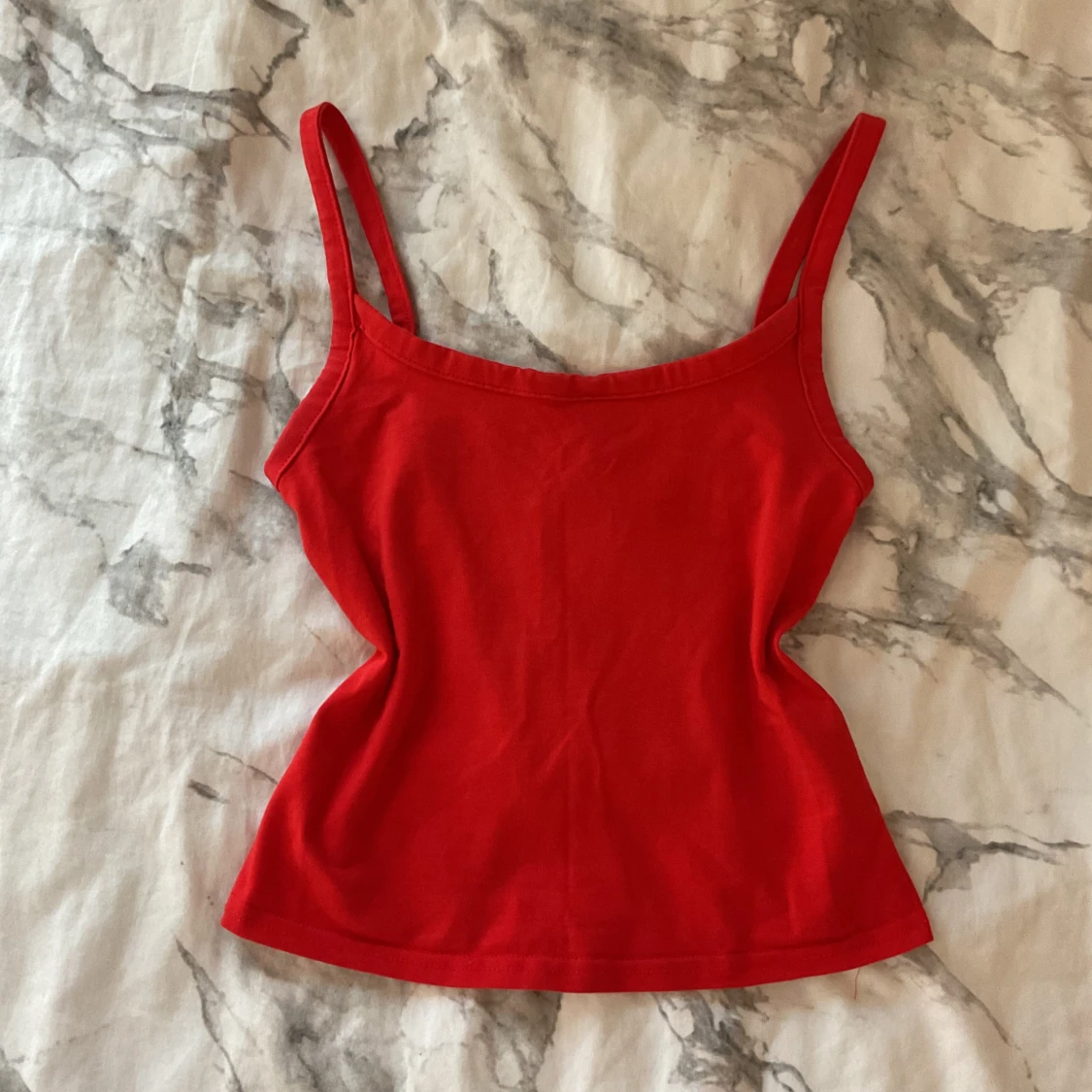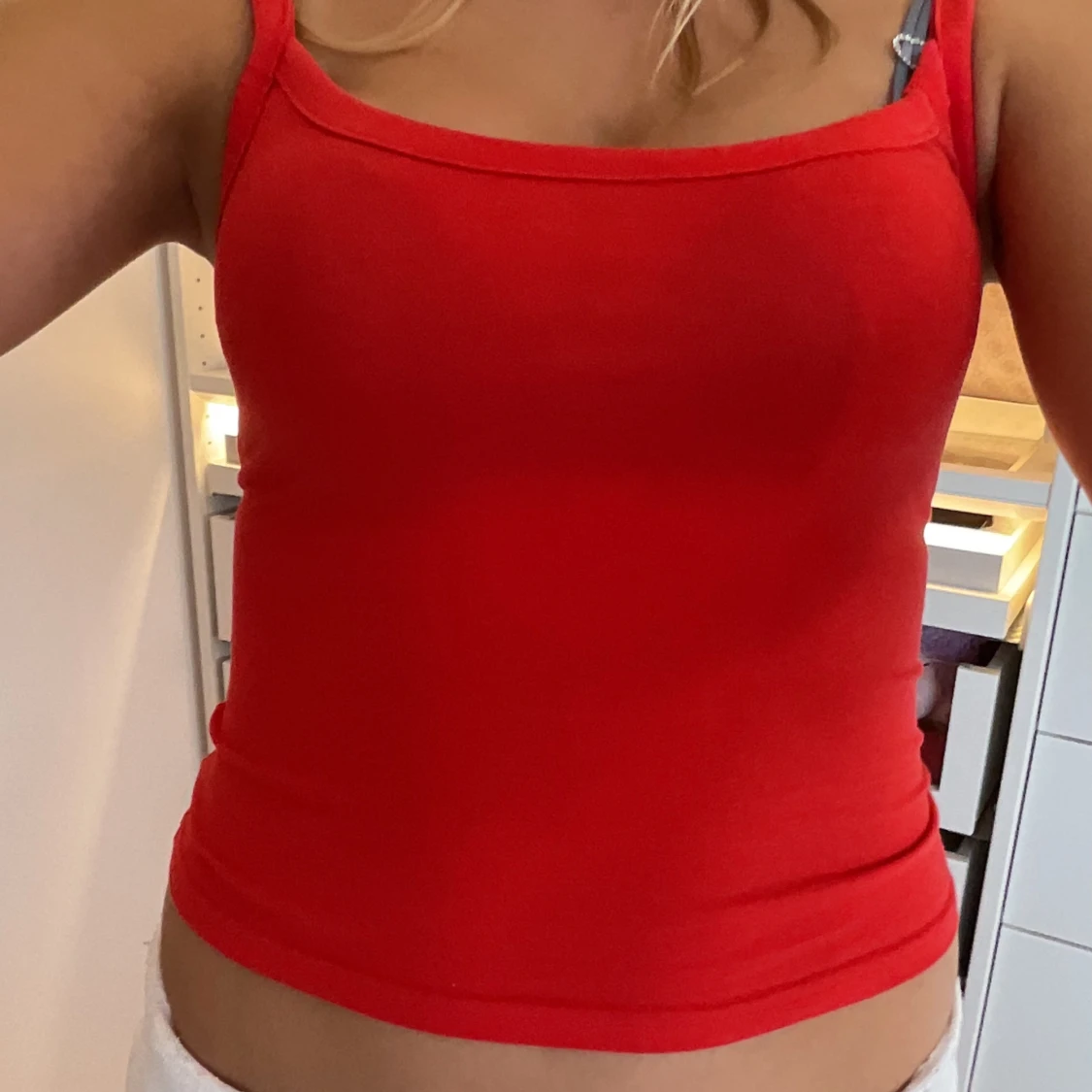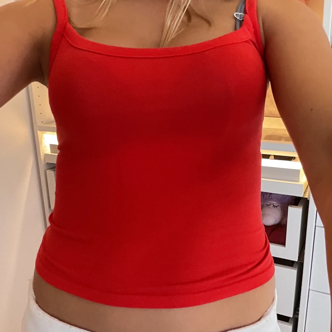 En enkel och snygg röd linnetopp med smala axelband och rak halsringning. Toppen är figurnära och passar perfekt till jeans eller kjol. Mjuk och stretchig känsla, perfekt för varma dagar.