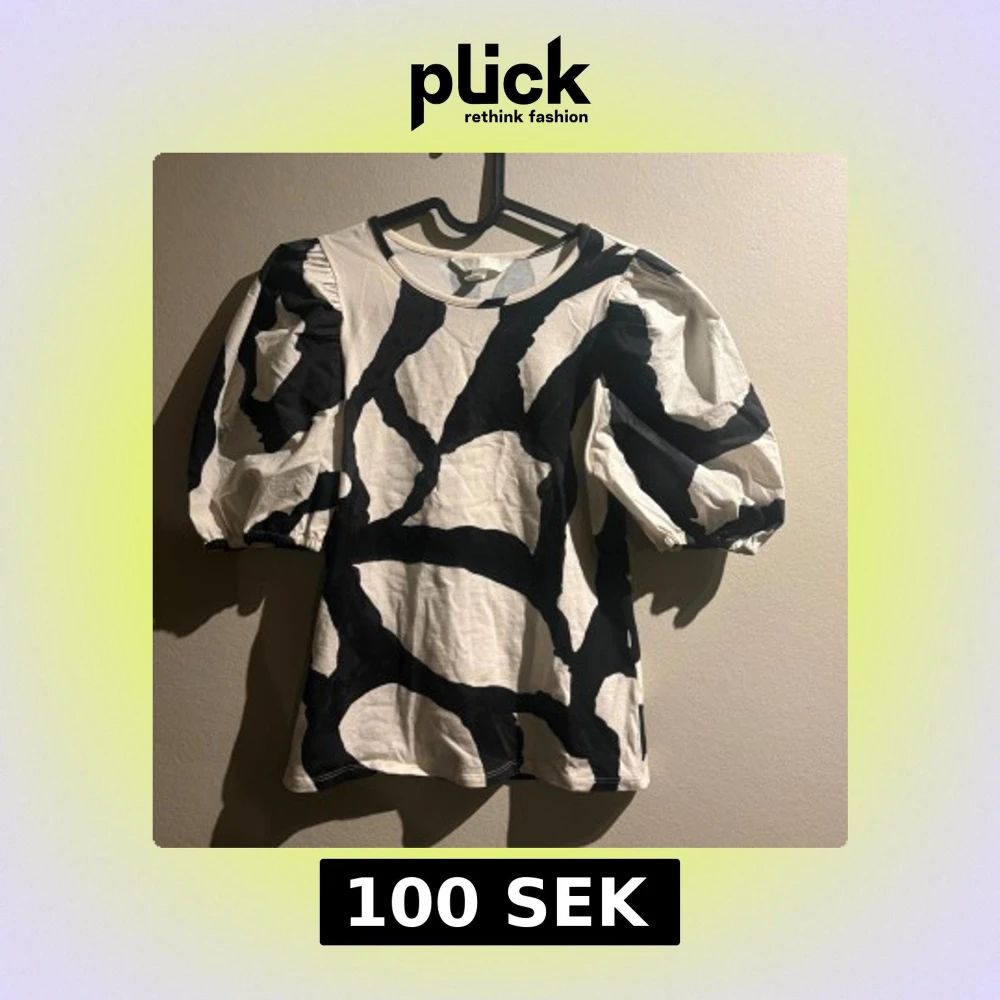 Cool topp från H&M i svartvitt abstrakt mönster. Modellen har puffiga korta ärmar med resår och rund halsringning. Tillverkad i mjuk bomull. En pytteliten fläck (bild 4) syns knappt något. Hör av er vid frågor❣️köparen står för frakten